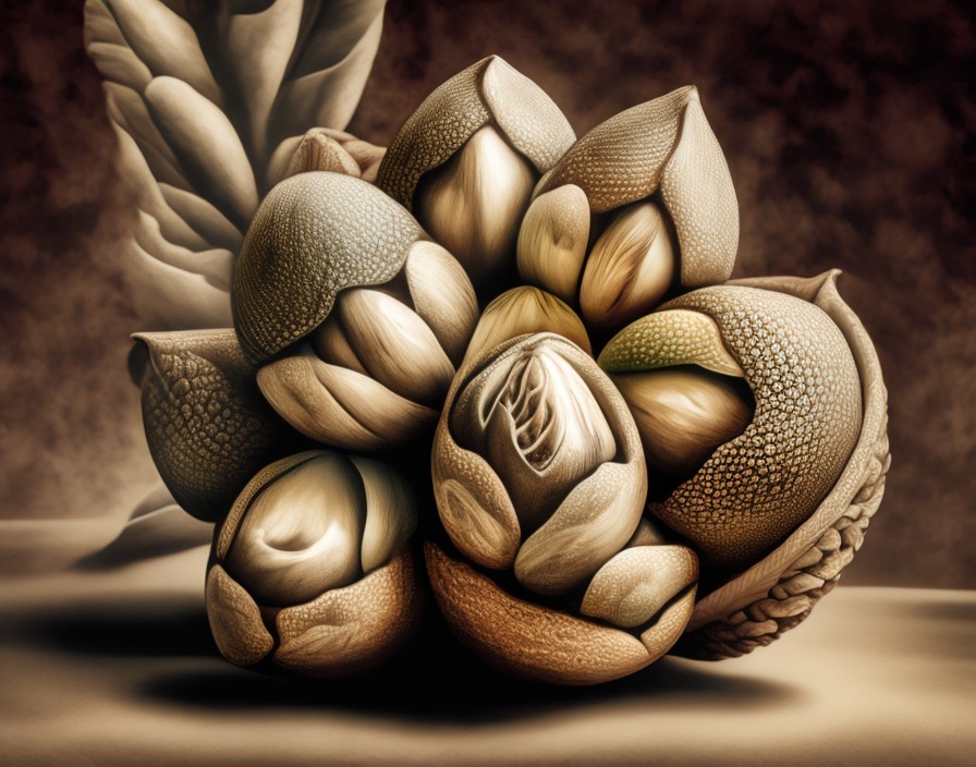 An artistic, surreal illustration of seed and plant elements with a central blooming structure, featuring earthy tones and intricate textures.