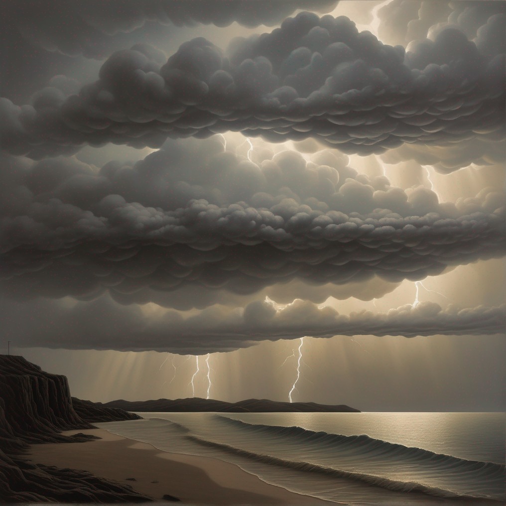 A painting of a stormy seascape with dramatic, layered clouds looming over a serene beach and a small house on the left.