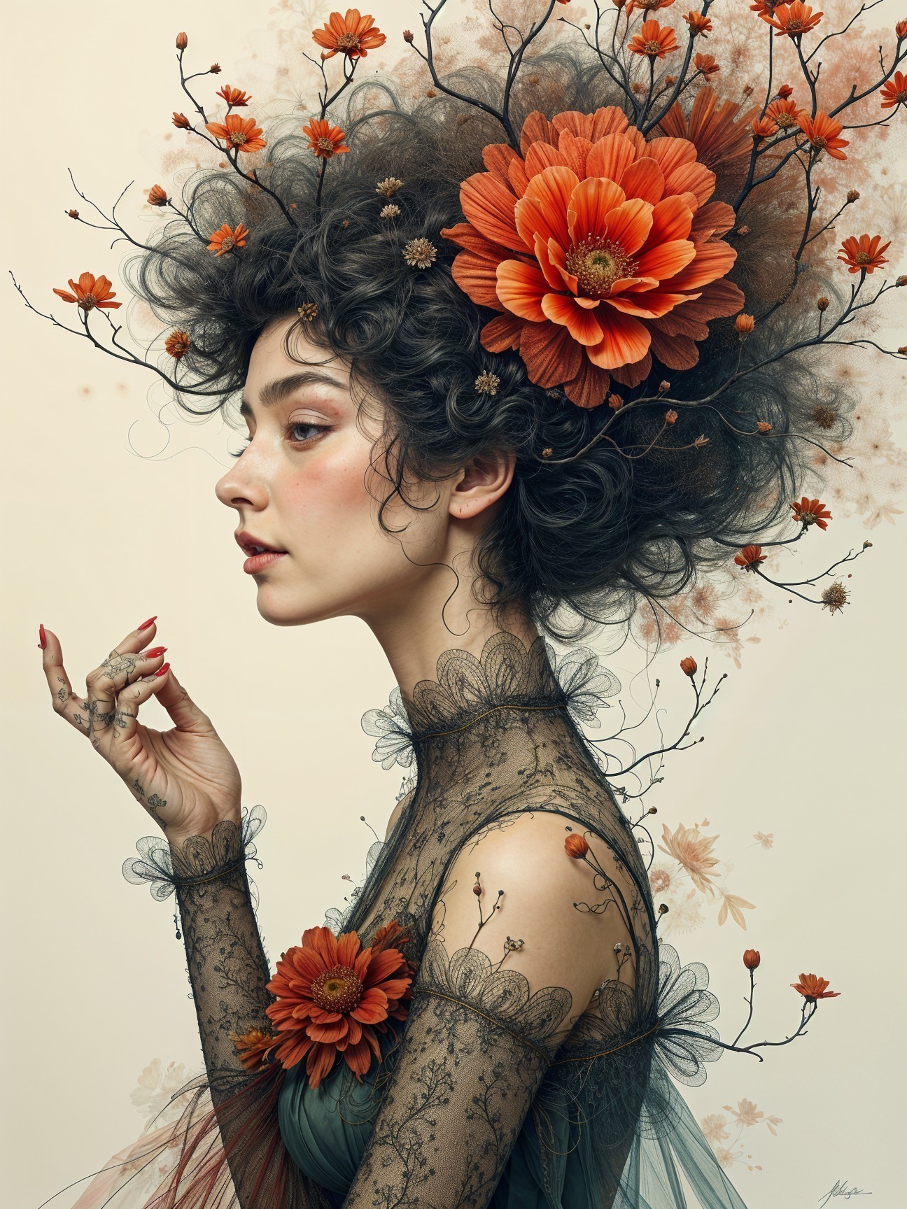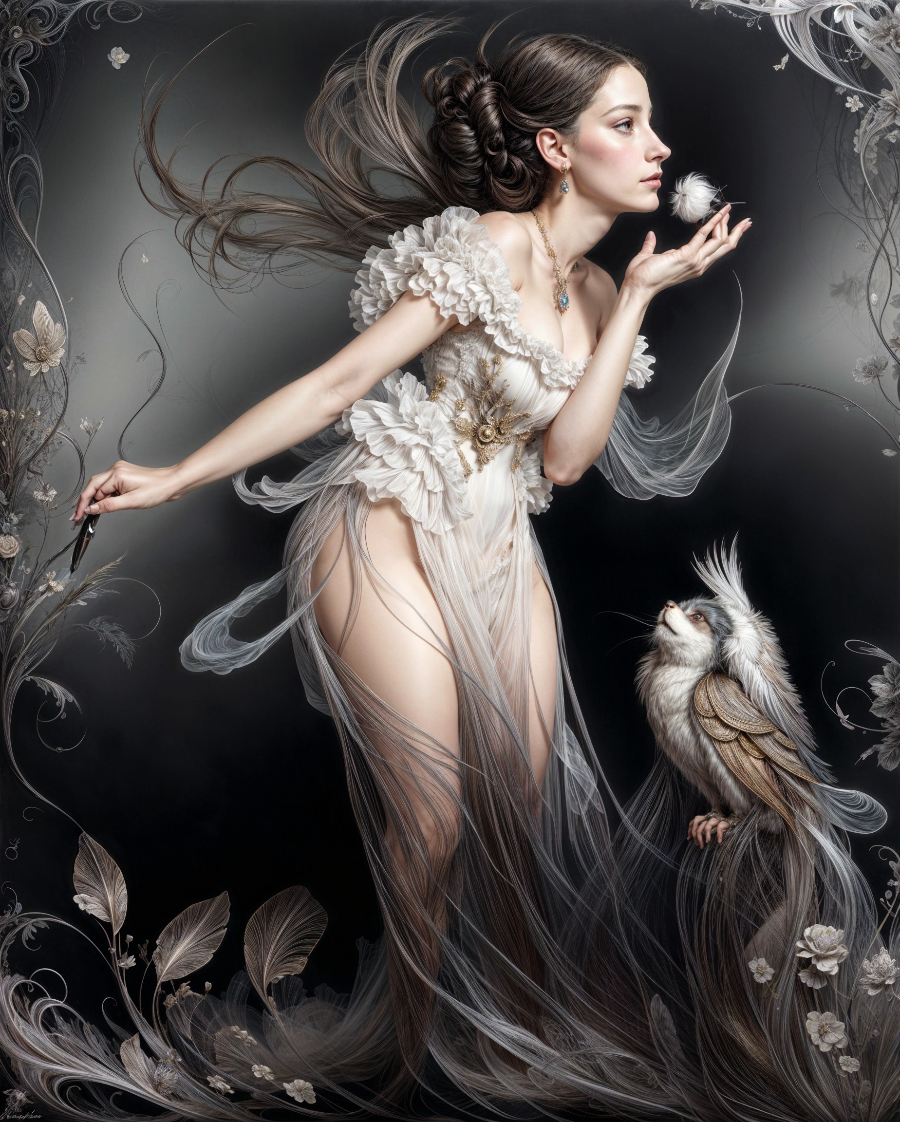 An elegant Art Nouveau lady crafted from fluffy filaments and glass, blending surreal elements reminiscent of dreamlike scenes. The colorful multilayered artwork showcases high-resolution detail in acrylic, pen, and wash techniques.