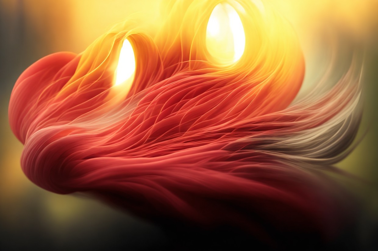 Vibrant abstract swirl with fiery red, orange hues, resembling a flame with hints of purple, creating a dynamic, fluid visual effect.