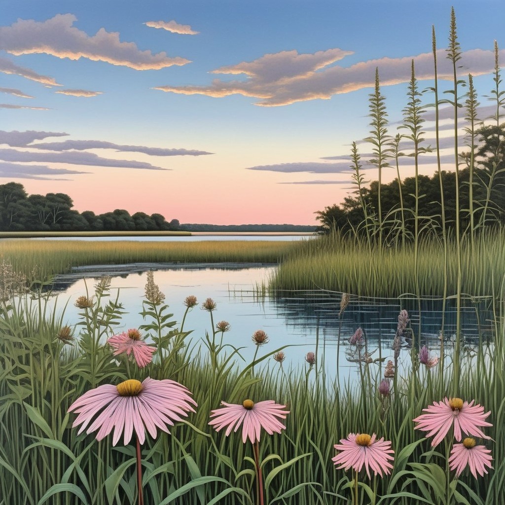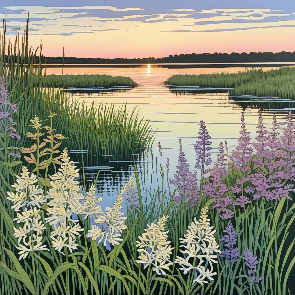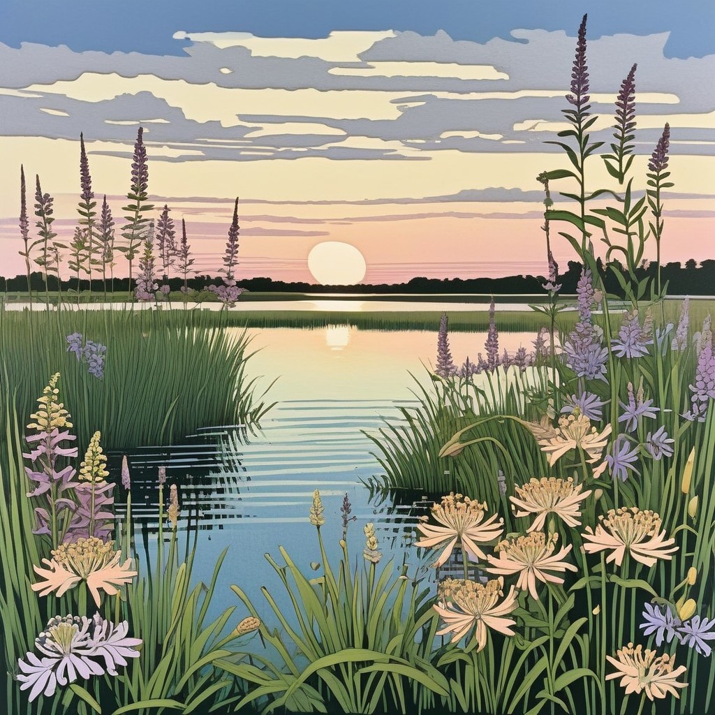 night on the marsh and the fogs are croaking, elimated sun in distance only clouds and light, off center design, blues and yellows, faded grey turquoise in the sky, more distinct lines in the linocut, faded colors, vintage, the meadowlands marsh in New Jersey, sorrounded by marsh flowers including flat topped white astor, Water hemlock, creeping water primrose, blue vervain, spotted joe pie weed, greater fringed gentian,, , more distinct lines in the lino cut, add pale grey turquoise to the sky, a scene viewed in New Jersey, night in August, Intricate linocut art of grasses and flowers and faded dried flower heads, light gray, pale light grey blue, soft grey pink, olive, rust and dark greens, kay sage, raw figuration,, trompe l'oeil compositions, rusticcore , .. surreal, beautiful