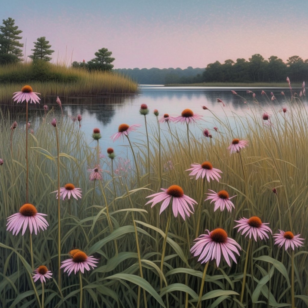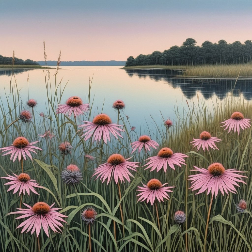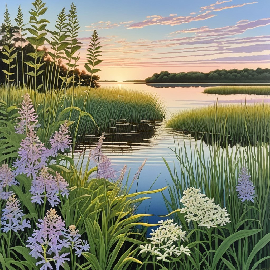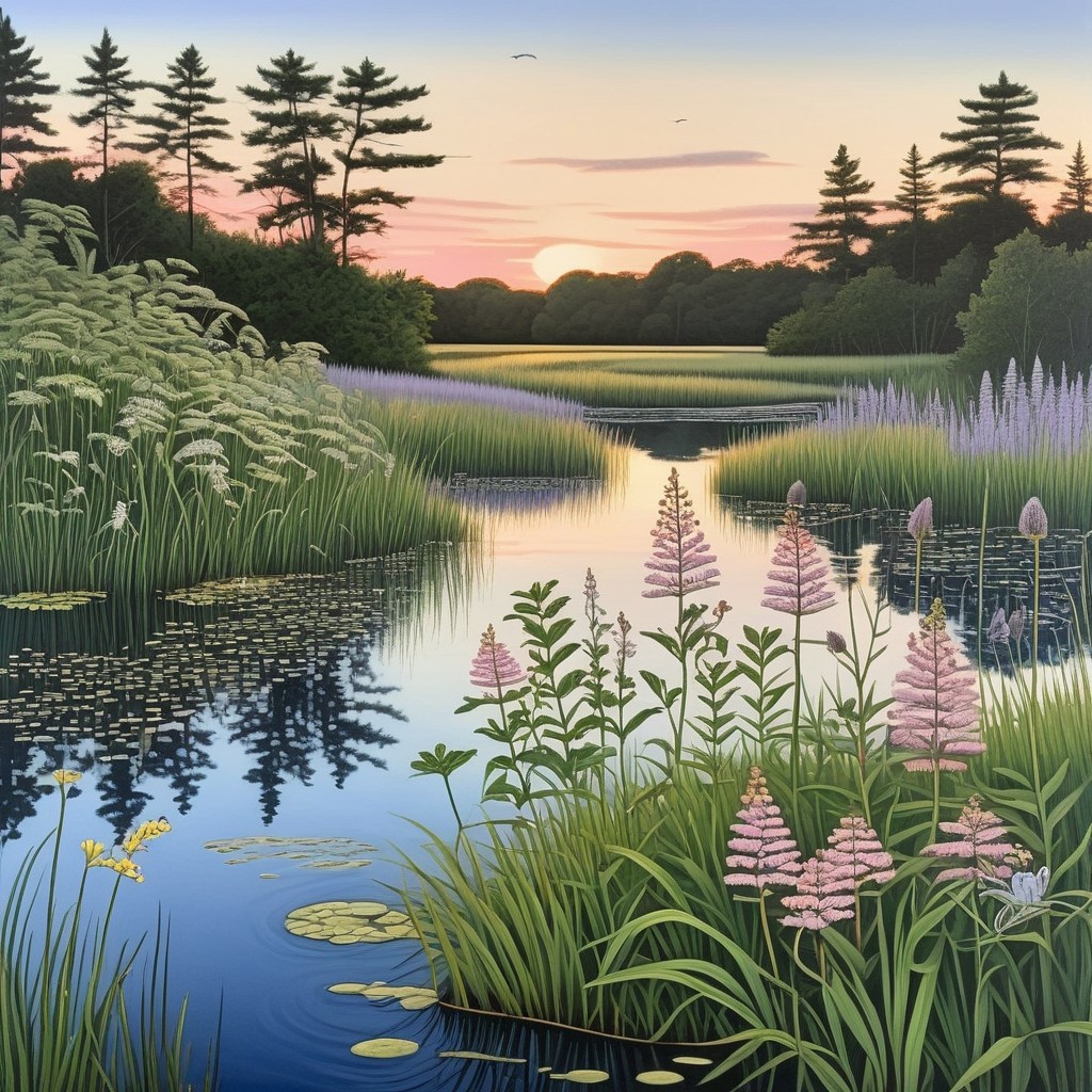 night on the marsh and the fogs are croaking, elimated sun in distance only clouds and light, off center design, blues and yellows, faded grey turquoise in the sky, more distinct lines in the linocut, faded colors, vintage, the meadowlands marsh in New Jersey, sorrounded by marsh flowers including flat topped white astor, Water hemlock, creeping water primrose, blue vervain, spotted joe pie weed, greater fringed gentian,, , more distinct lines in the lino cut, add pale grey turquoise to the sky, a scene viewed in New Jersey, night in August, Intricate linocut art of grasses and flowers and faded dried flower heads, light gray, pale light grey blue, soft grey pink, olive, rust and dark greens, kay sage, raw figuration,, trompe l'oeil compositions, rusticcore , .. surreal, beautiful