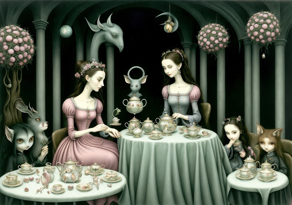 Care to join for tea and cookies?, by Leonora Carrington, Naoto Hattori, Nicoletta Ceccoli, James Jean, Mark Ryden, Brian Froud, Hieronymus Bosch, Imperial Colors, Elegant, Polished, Masterful Surrealism