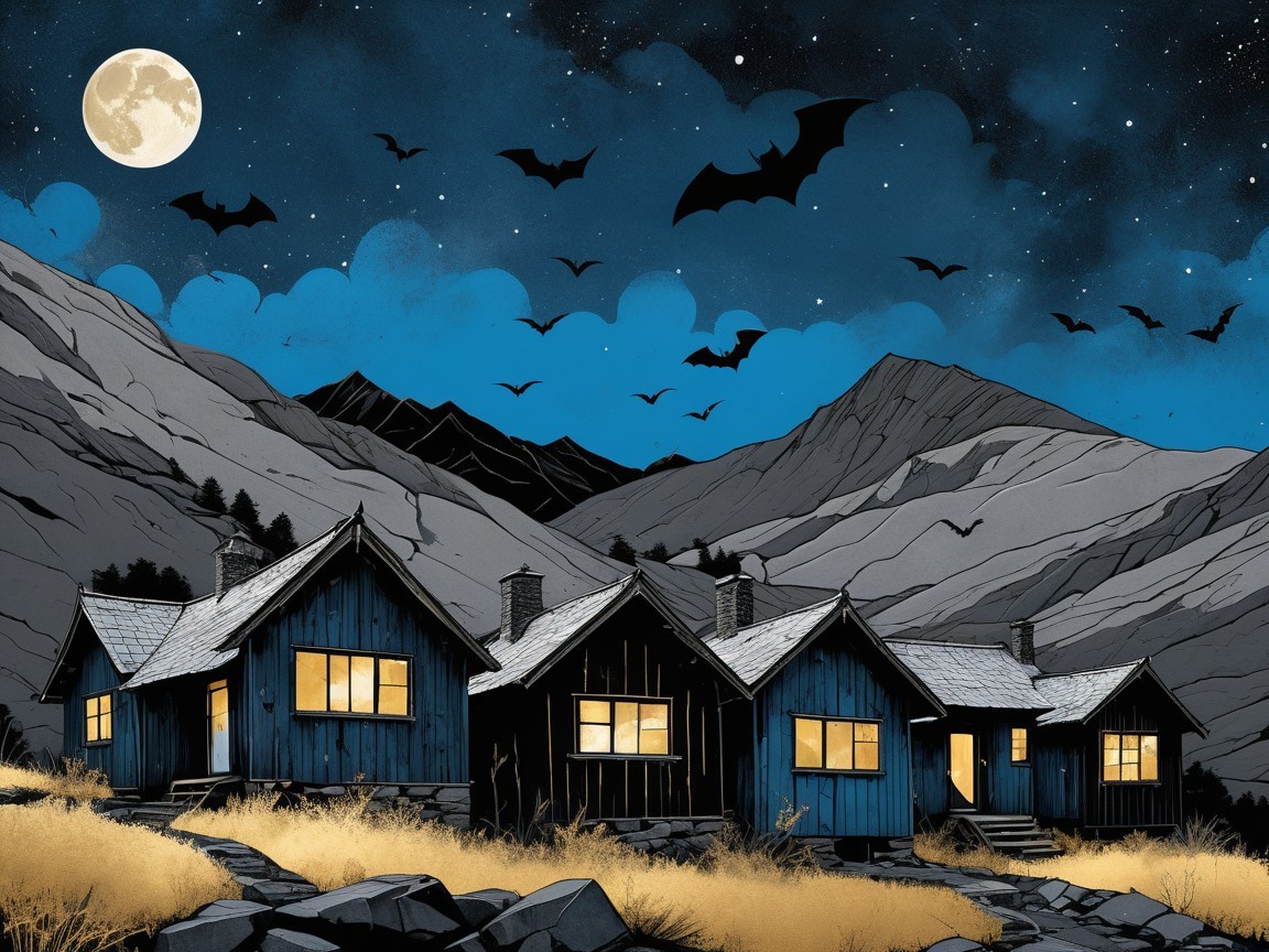 A tranquil night scene depicts dark mountains under a full moon. Silhouettes of bats fly overhead as cozy houses glow warmly. The landscape is serene, blending nature and human habitation.