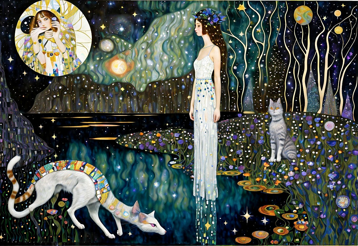 Witch in white dress of beauty and cat-creature by a lake in forest, weird nightscape, cosmic sky, Celestial spring and waterfalls. Painting by Gustav Klimt and Egon Schiele. Metal paper mixed media with glass shards and sparkly paints. small cosmic astronomy photo details of galaxies and star clusters