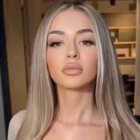 A woman with long, flowing blonde hair and a radiant smile poses confidently. Her makeup is elegant, enhancing her features in a soft, glamorous setting with warm lighting in the background.