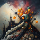 A surreal landscape features a towering figure adorned with orbs, emerging from vibrant, swirling colors. In the background, a dark, eerie castle looms under a dramatic sky filled with clouds.