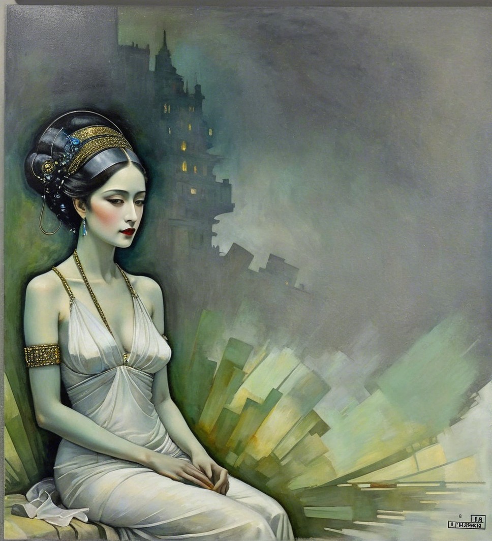 A stunning painting features a poised woman in a flowing white dress adorned with gold, gazing thoughtfully over a misty city skyline, evoking a sense of nostalgia and elegance.