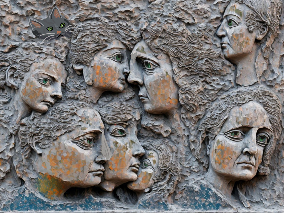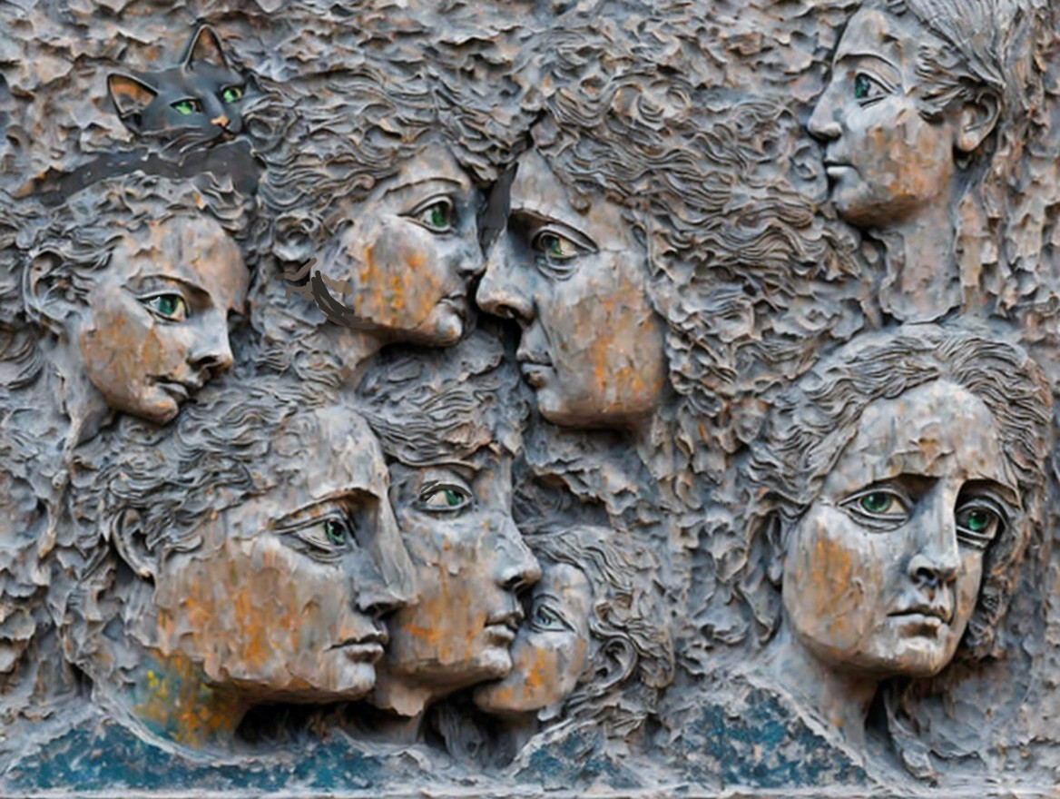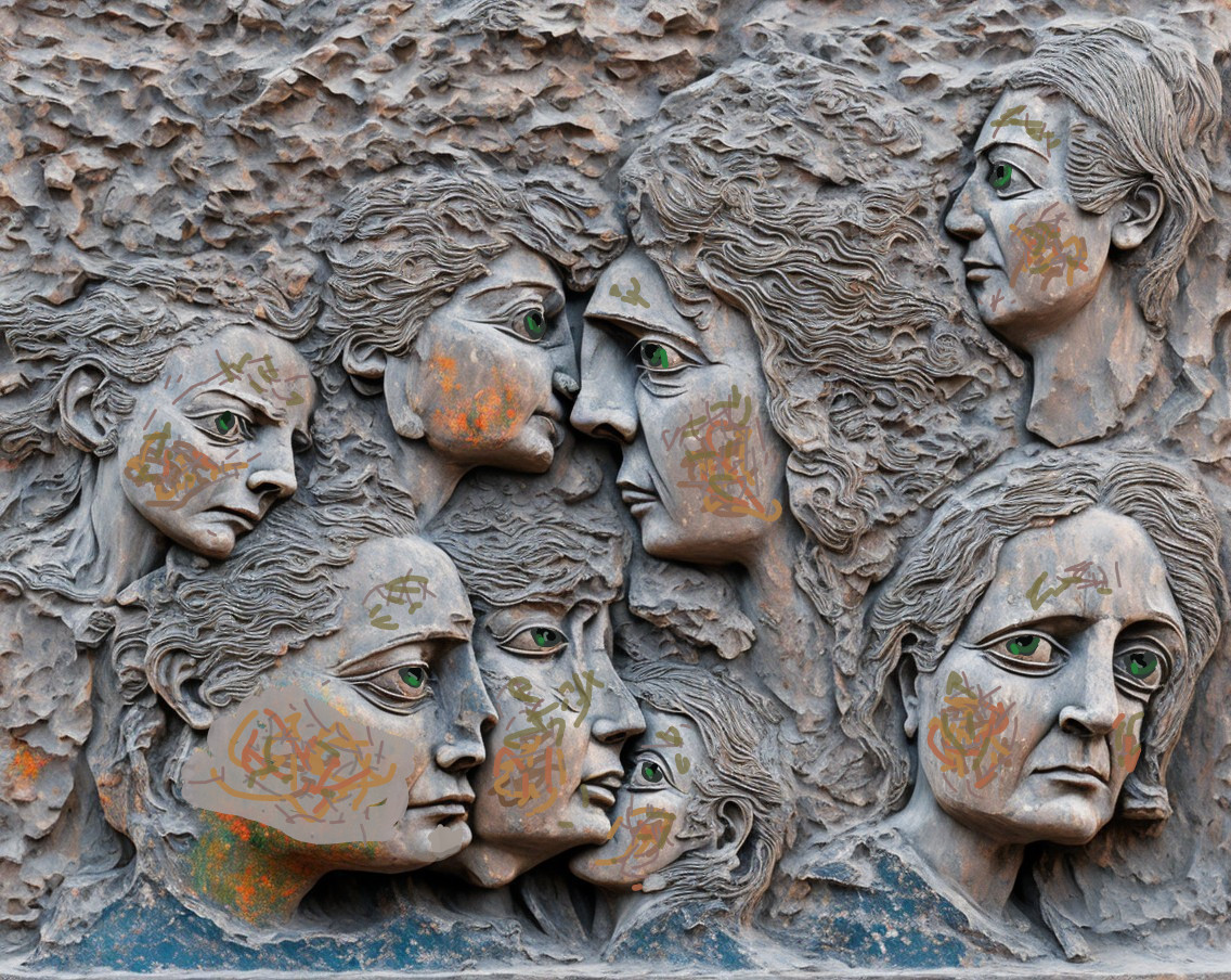 + Prompt:Inspired by Louis Jover, half-relief sculpture, heads, colorful people hugging each other, family, rough carved texture, dark expressive eyes, weathered appearance, generations depicted (mother, father, grandfather, child), embracing poses, integrated into rock, dynamic composition, raw emotion, cultural references, contemporary twist, intricate details, mixed media elements, urban art influence.