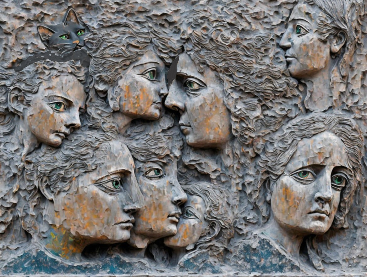 Prompt: Inspired by Louis Jover, Family with cat, girls with long curly hair and dark shiny green eyes made of glass, half-relief, heads, rough carved texture, dark expressive eyes, weathered appearance, generations depicted (mother, father, grandfather, child), embracing poses, integrated into rock, dynamic composition, raw emotion, cultural references, contemporary twist, intricate details, mixed media elements, urban art influence.
