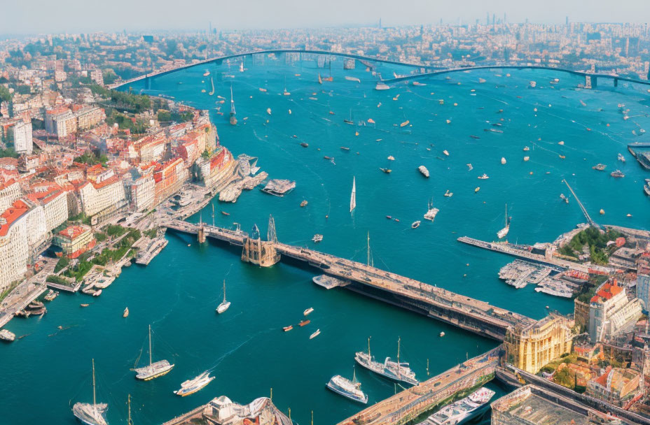 Karaköy/İstanbul, beautiful ships, bridge. Sunset, street lamps. Alphonse Mucha style, watercolor, ink. Picturesque and colorful