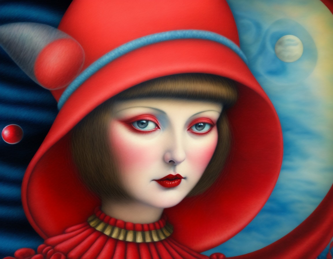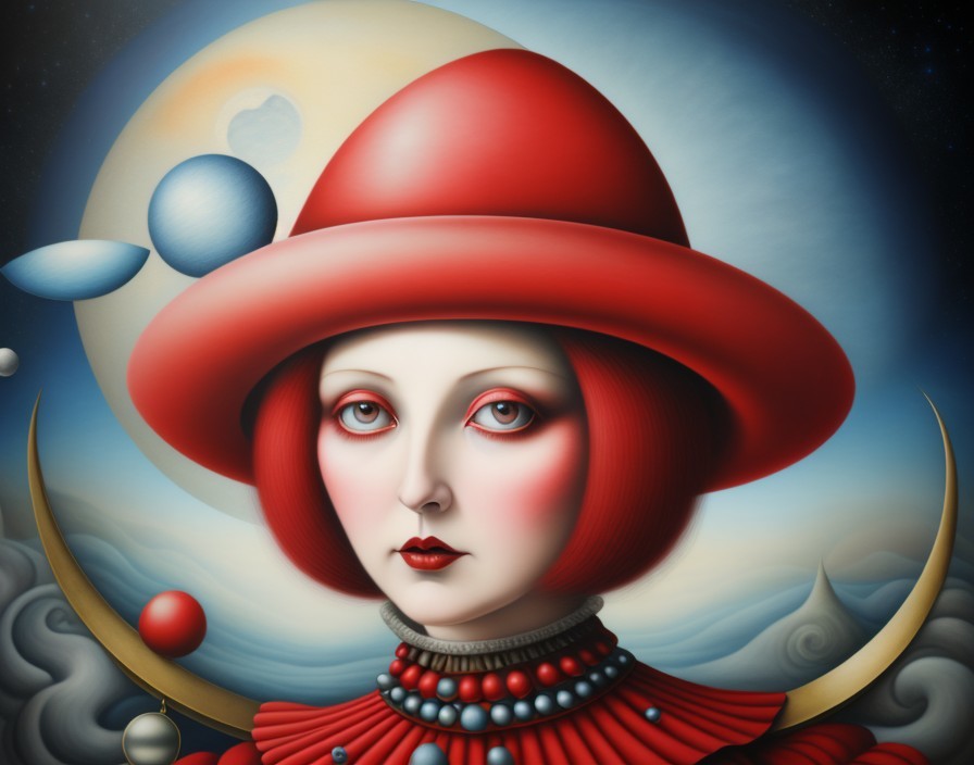 Hear me calling. Woman wearing her favorite red hat, open eyes, Large luminis moon. Abstract, surreal, Optical illusion, Catrin Welz-Stein