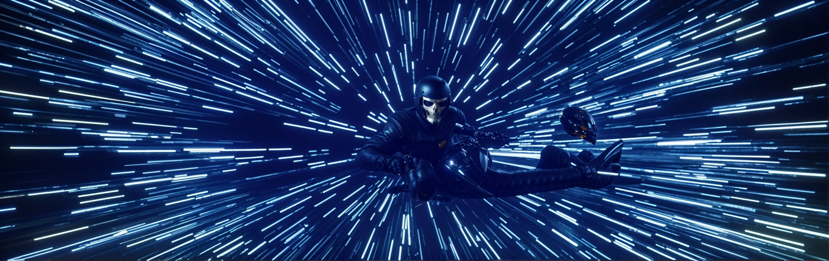 Create a dramatic image featuring a motorcycle rider, positioned prominently in the foreground, sitting atop a sleek, powerful black motorcycle. The rider is clad in a full black leather outfit and a glossy black helmet, obscuring their facial features. The motorcycle features a skull motif on its front, enhancing its edgy appearance.