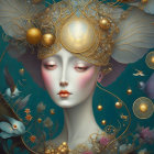 A serene woman adorned with intricate golden headgear and soft floral accents stands against a vibrant teal background, surrounded by delicate butterflies and ethereal lanterns.