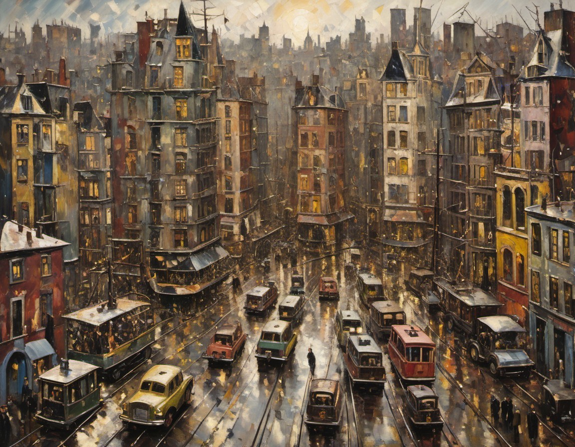 A vibrant, colorful painting of a busy city street bustling with cars, trams, and pedestrians beneath a sky filled with floating papers.