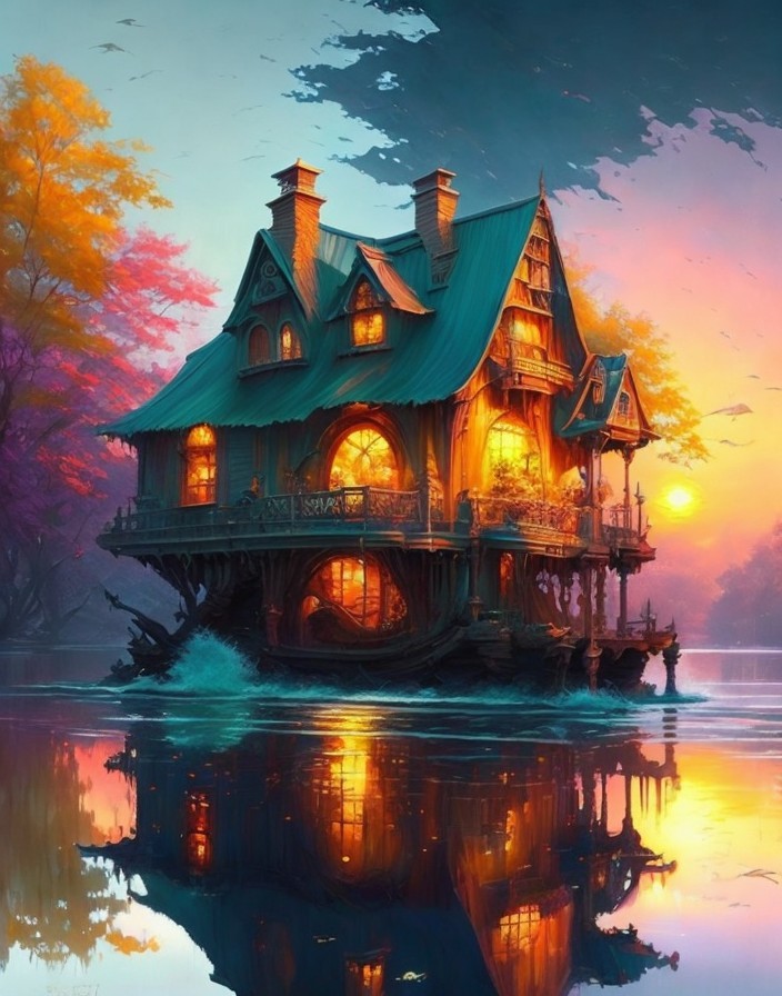 Prompt: A stunning beautiful fantasy house, fantasy art muted pastels.sunset, water, outline by Thomas Kinkade and watercolour by Wadim Kashin WLOP and Arthur Rackham