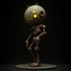 A vibrant, abstract sculpture featuring a spherical top covered in colorful holes, supported by a twisting, spiraling structure of dots and shapes, all against a dark backdrop.