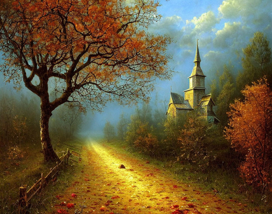 a road leading through an apple orchard to an old, wooden, abandoned church; rainy evening; light fog; autumn; you can see the blue sky through the clouds; Ivan Shishkin,Victo Ngai,Gregorio Catarino,Cyril Rolando,Michal Karcz,Anato Finnstark,Flavio Greco Paglia, hyperdetailed defined oil painting, vibrant colors, 8K resolution, polished divine photorealistic intricate complex HDR, amber glow, dreamy