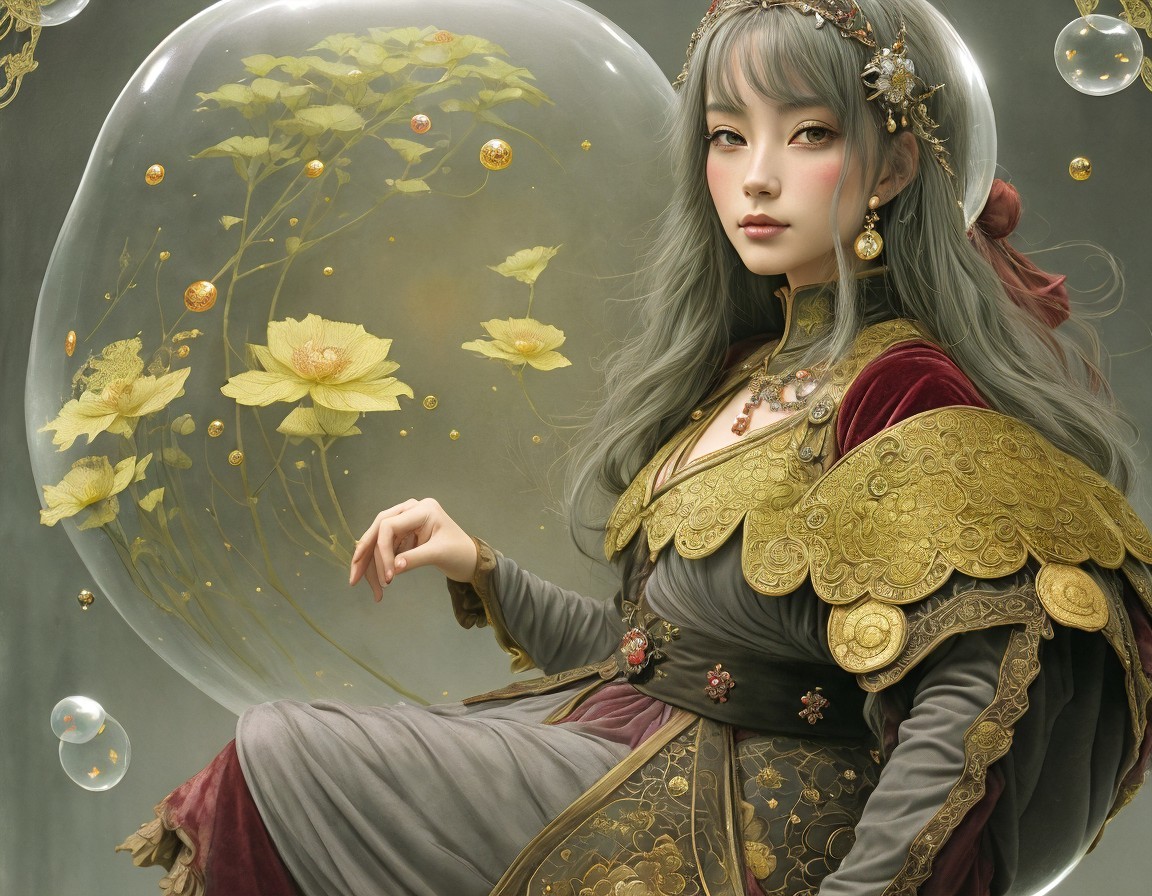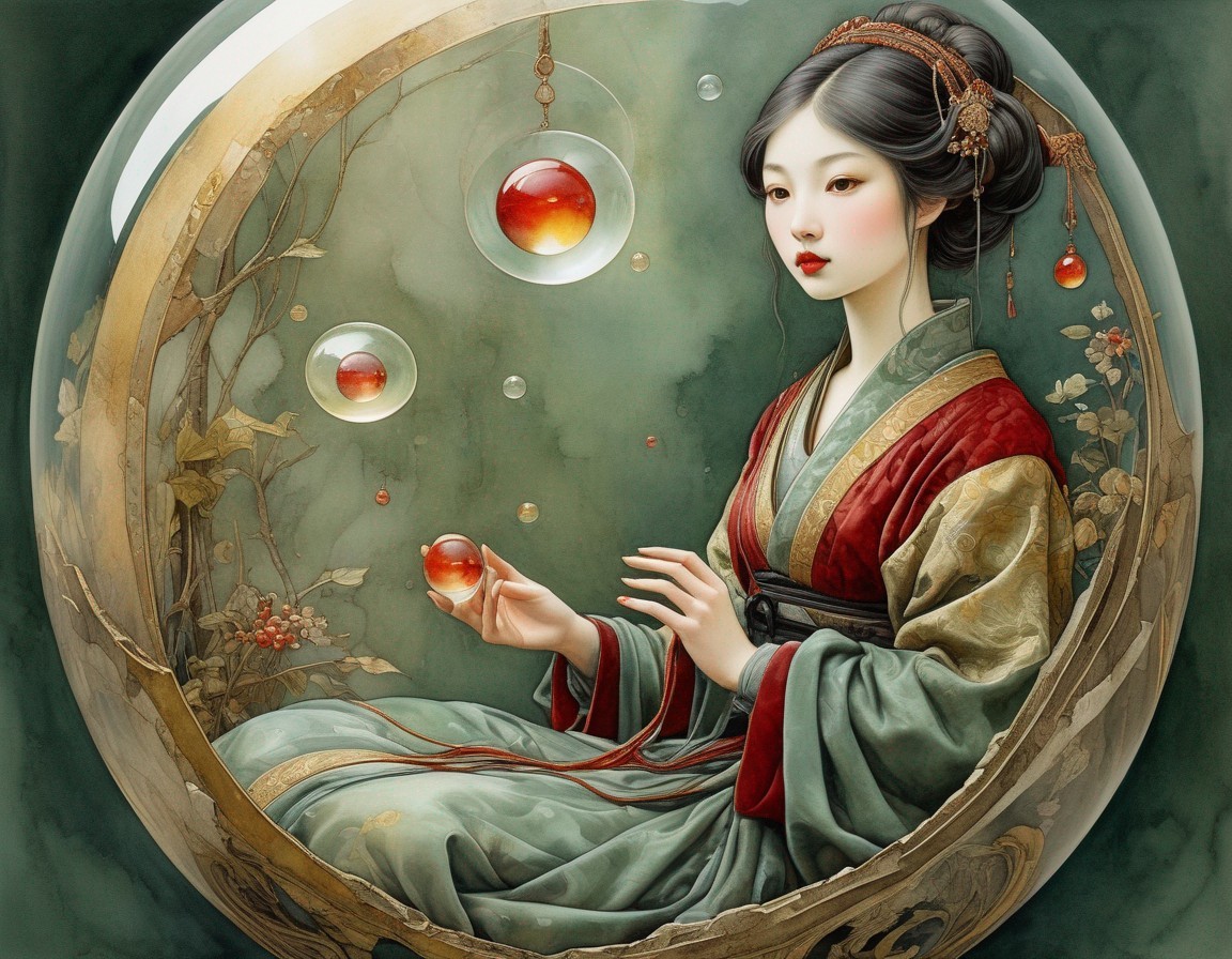 Beauty girl in a bubble,, Medieval Japanese Artists Sumi-e Style, grayish green, Ruby red, Velvet Black, Shabby, Dull Gold, Amber Gray, Golden Ratio, Surreal Fantasy, Elegant, High Definition Ultra Fine 3D Line, Zenangle Style, Watercolor Patchwork , Arthur Rackham Style, Paul Kidby, , Jacek yerka, Extremely Detailed, Intricate, Thoughtful, HDR, Fractal, Beautiful, Award Winning, Fantasy Look, Fantasy, Crisp Quality
