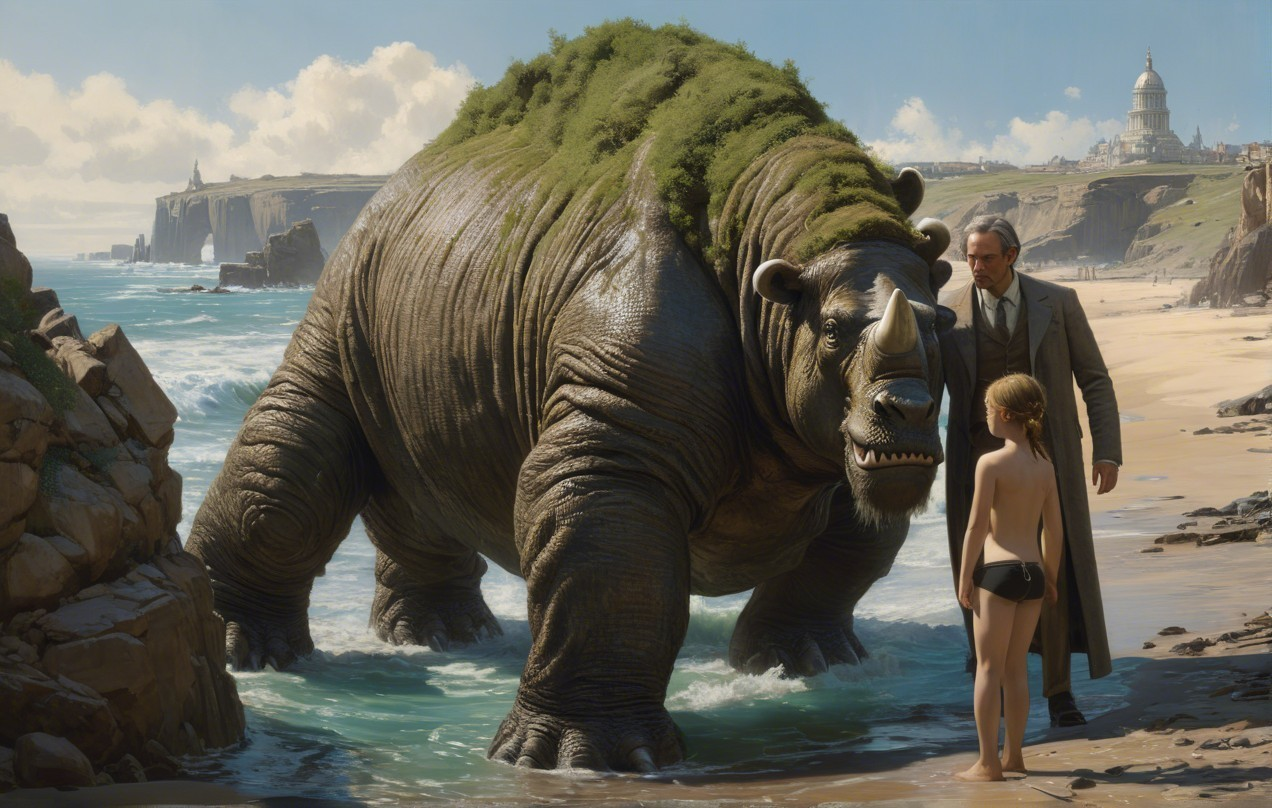 A giant, moss-covered creature emerges from the ocean, facing a child on the beach. A man in a suit stands nearby, highlighting the surreal encounter between nature and humanity.