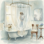 Prompt: watercolor painting of an early 1900s bathroom interior in soft cream and pale blue tones. A woman is taking a shower in a vintage clawfoot bathtub, surrounded by translucent curtains that gently obscure her body — only the graceful shadow of her silhouette is visible through the mist and fabric. Warm daylight filters through a frosted window, reflecting softly on porcelain tiles and brass fixtures. The room includes period details: a wooden chair with a neatly folded towel, a small table with a vase of flowers, and a mirror slightly blurred by steam. The atmosphere feels intimate, serene, and nostalgic, painted in delicate pastel washes with subtle light and shadow transitions, in the refined early 20th-century watercolor style. The surface shows a gentle watercolor paper grain texture, enhancing the softness and realism of the artwork.