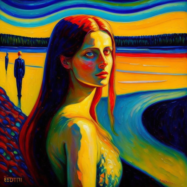 Colorful painting of a woman in flowing hair against surreal landscape.