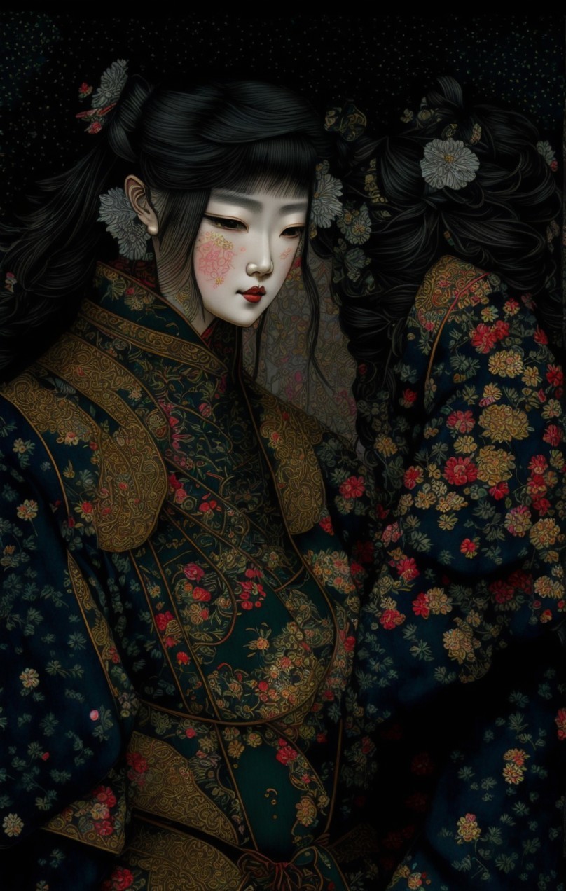 An illustration of a woman in traditional Asian attire with intricate floral patterns, adorned with delicate hair ornaments and a contemplative expression.