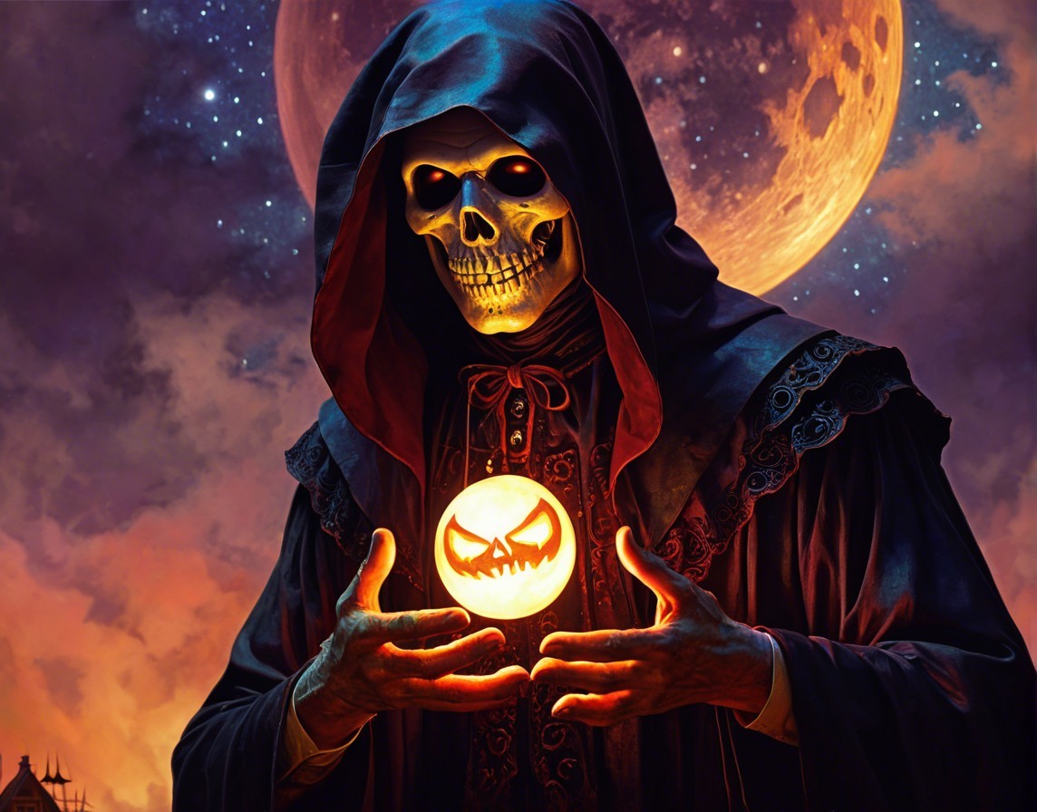 Cloaked Figure with Glowing Pumpkin at Twilight Sky