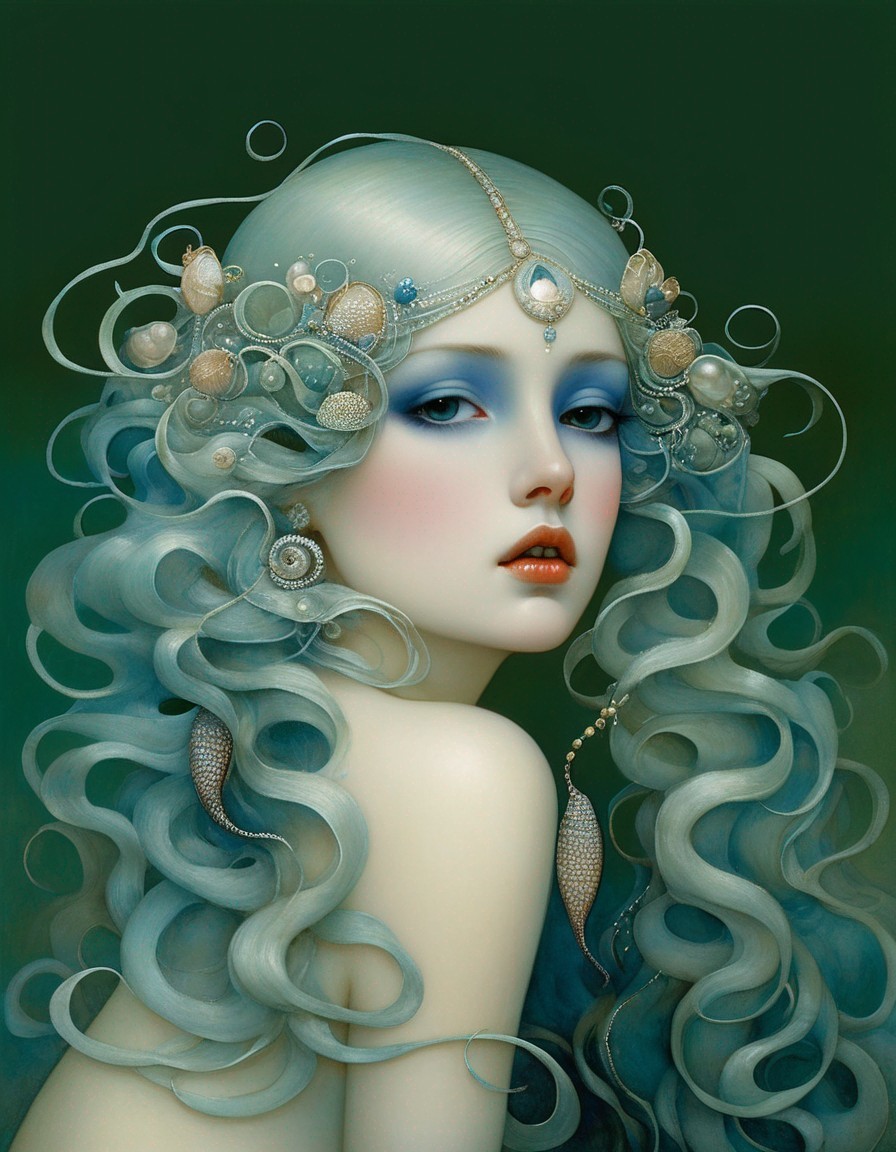 Majestic mermaid with sun crown and flowing hair on dark green background