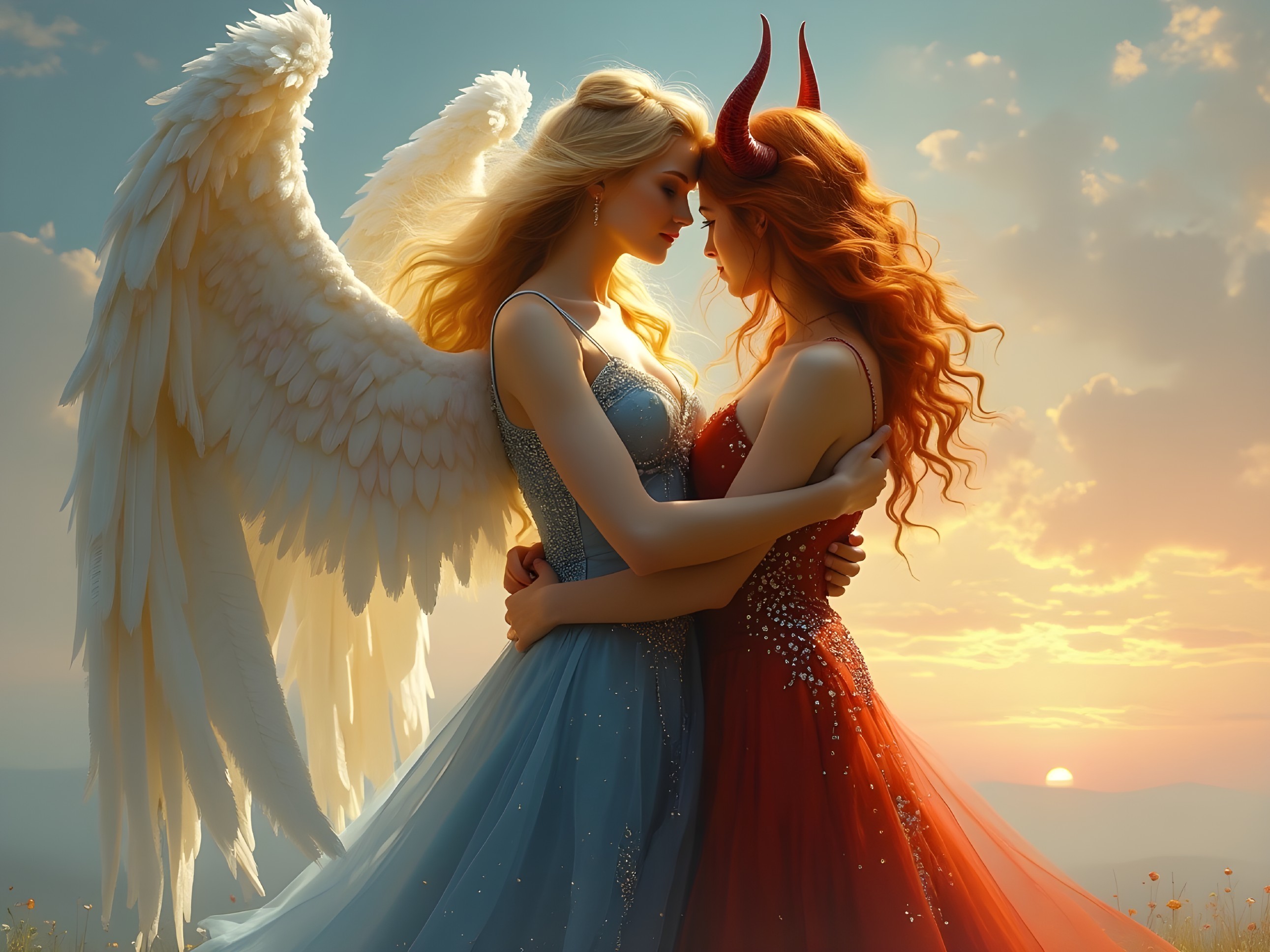 In a serene sunset, an angel with white wings in a blue gown embraces a devil with red horns, donning a stunning red dress. Their contrasting forms highlight harmony in duality.