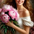 A young woman with flowing blonde hair smiles gently, surrounded by vibrant pink roses. Her soft features and delicate attire create a serene, enchanting atmosphere.