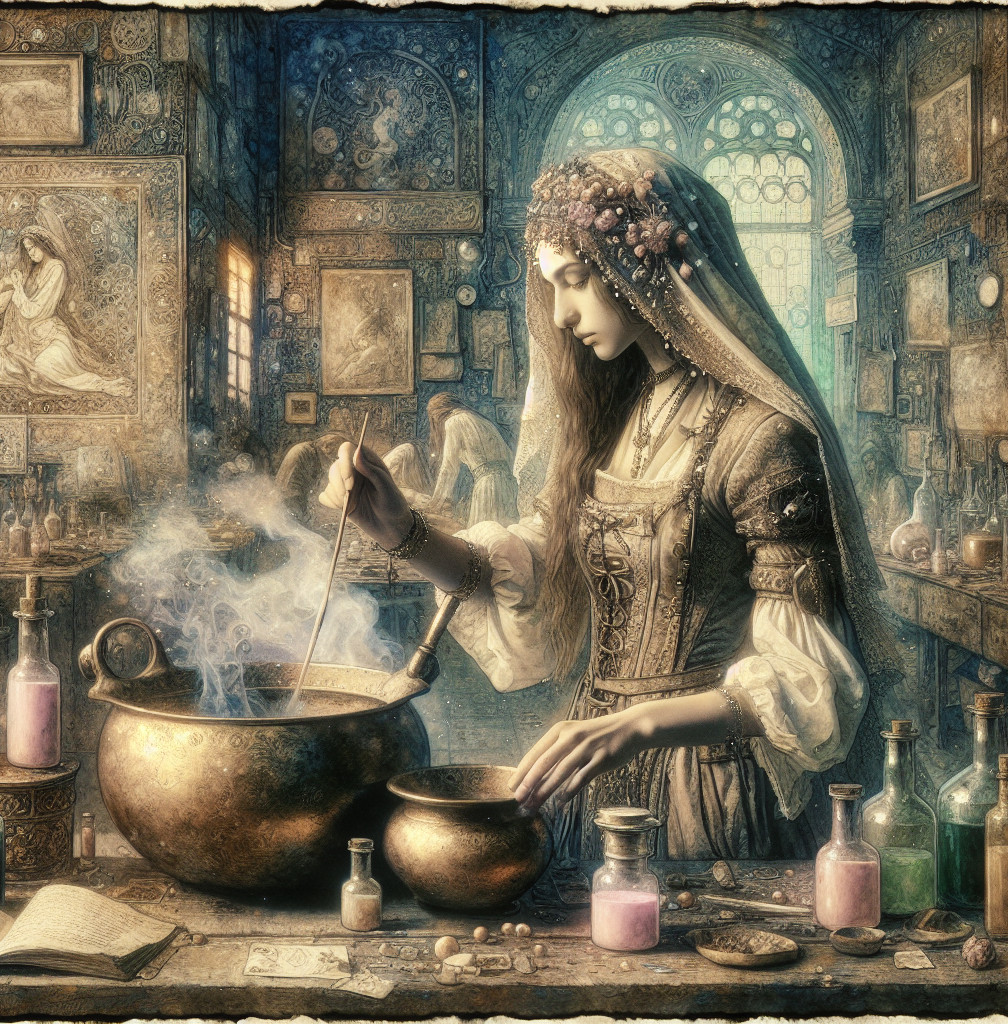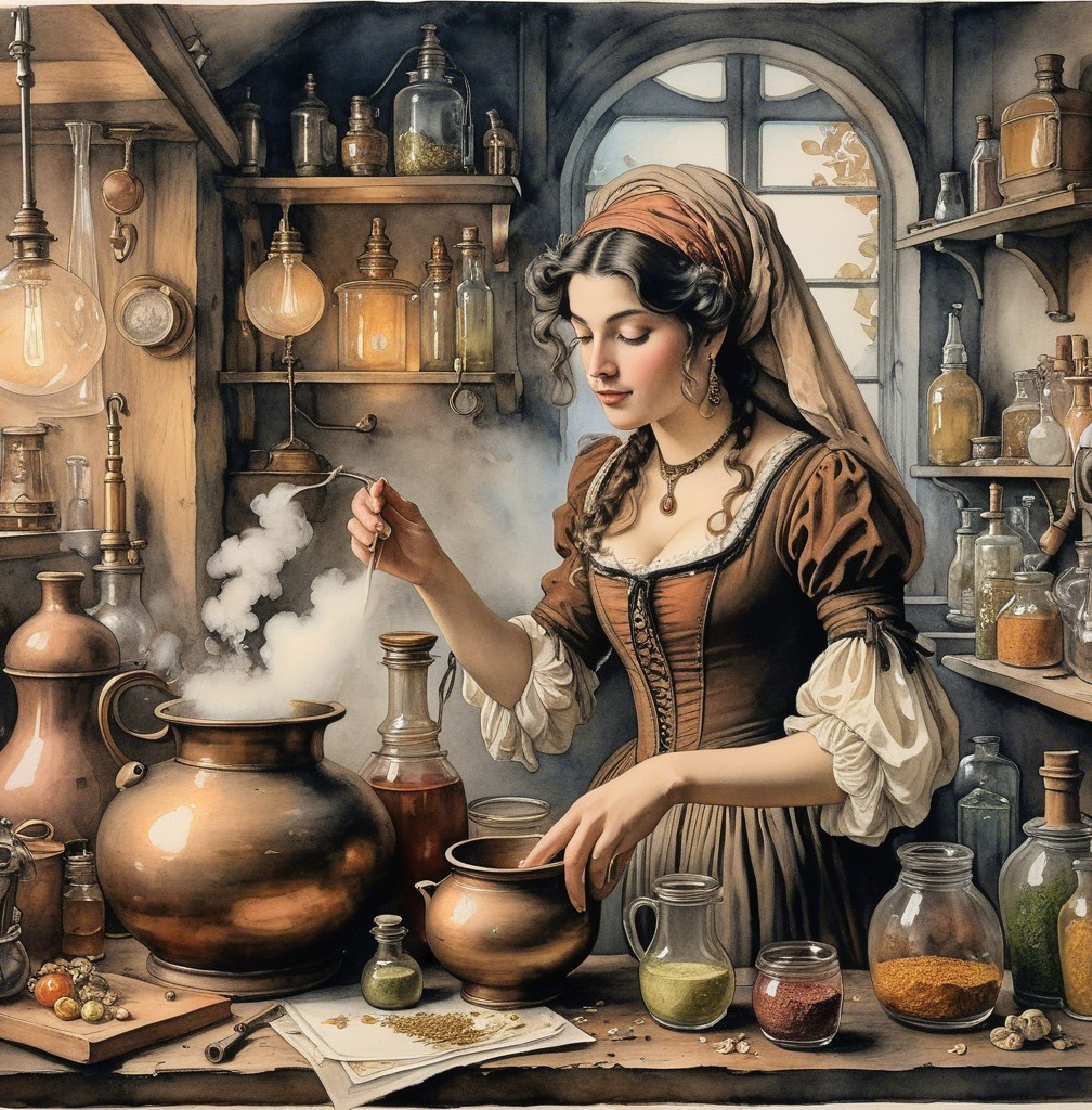 . Gypsy lady mixing herbal concoctions in her workroom., colored ink drawing, watercolor artwork on old withered paper, vintage, by Caravaggio, Fragonard, Anton Pieck, pale colors, high detail, intricately detailed, hyperdetailed volumetric lighting, art nouveau graphic steampunk ., whimsical, beautiful, poignant, touching. colors blush bronze, black. soft watercolor extra water in magical realism by Annigoni, Egon Schiele, Milo Manara, Botticelli, Catrin Welz-Stein, Jean Metzinger, Klimt, perfect eyes, perfect handsface, highly detailed, complementary colors, hyper detailed. Watercolor and ink splatter, dynamic pose, dark blue background, unreal engine, alphonse mucha, global illumination, detailed and intricate environment Beautiful woman in the style of Pino Daeni Dorota Piotrowiak Edward Gorey, junji ito, klimnt , gold leaf color, silver leaf color beautiful dynamic lighting high definition hdr * Random prompt award winning Max Ernst ultra detailed 4K 3D Texture