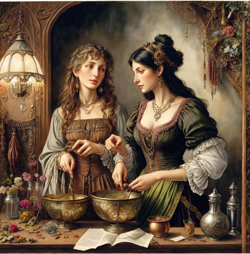 Prompt: ". Gypsy lady mixing herbal concoctions in her workroom., colored ink drawing, watercolor artwork on old withered paper, vintage, by Caravaggio, Fragonard, Anton Pieck, pale colors, high detail, intricately detailed, hyperdetailed volumetric lighting, art nouveau graphic steampunk ., whimsical, beautiful, poignant, touching. colors blush bronze, black. soft watercolor extra water in magical realism by Annigoni, Egon Schiele, Milo Manara, Botticelli, Catrin Welz-Stein, Jean Metzinger, Klimt, perfect eyes, perfect handsface, highly detailed, complementary colors, hyper detailed. Watercolor and ink splatter, dynamic pose, dark blue background, unreal engine, alphonse mucha, global illumination, detailed and intricate environment Beautiful woman in the style of Pino Daeni Dorota Piotrowiak Edward Gorey, junji ito, klimnt , gold leaf color, silver leaf color beautiful dynamic lighting high definition hdr * Random prompt award winning Max Ernst ultra detailed 4K 3D Texture"