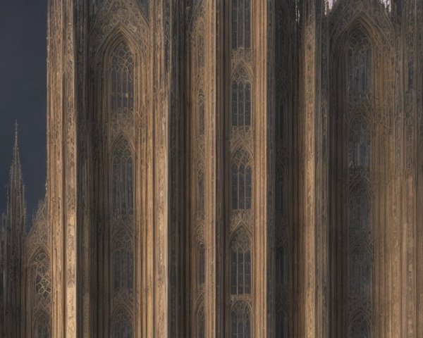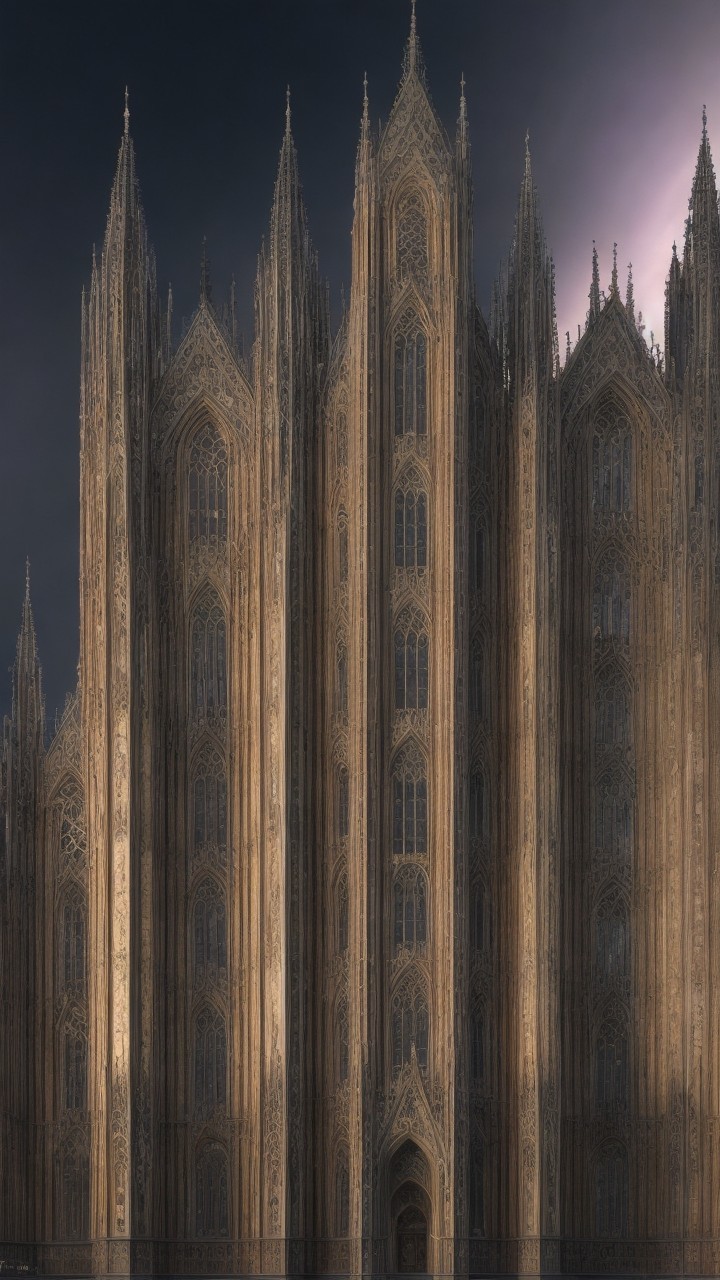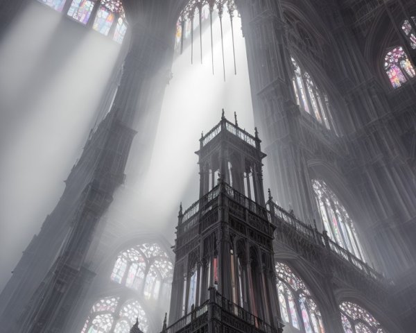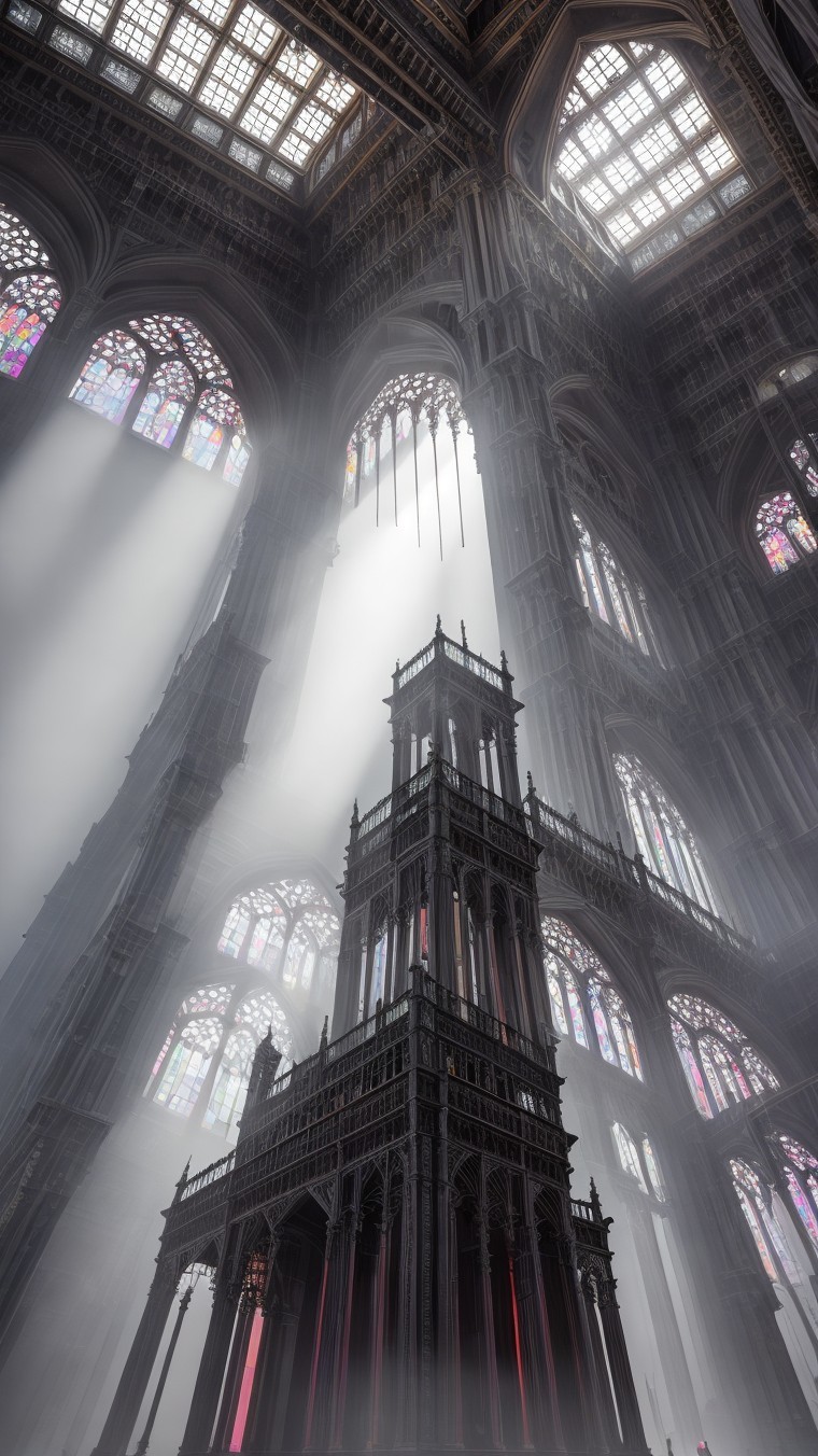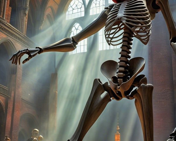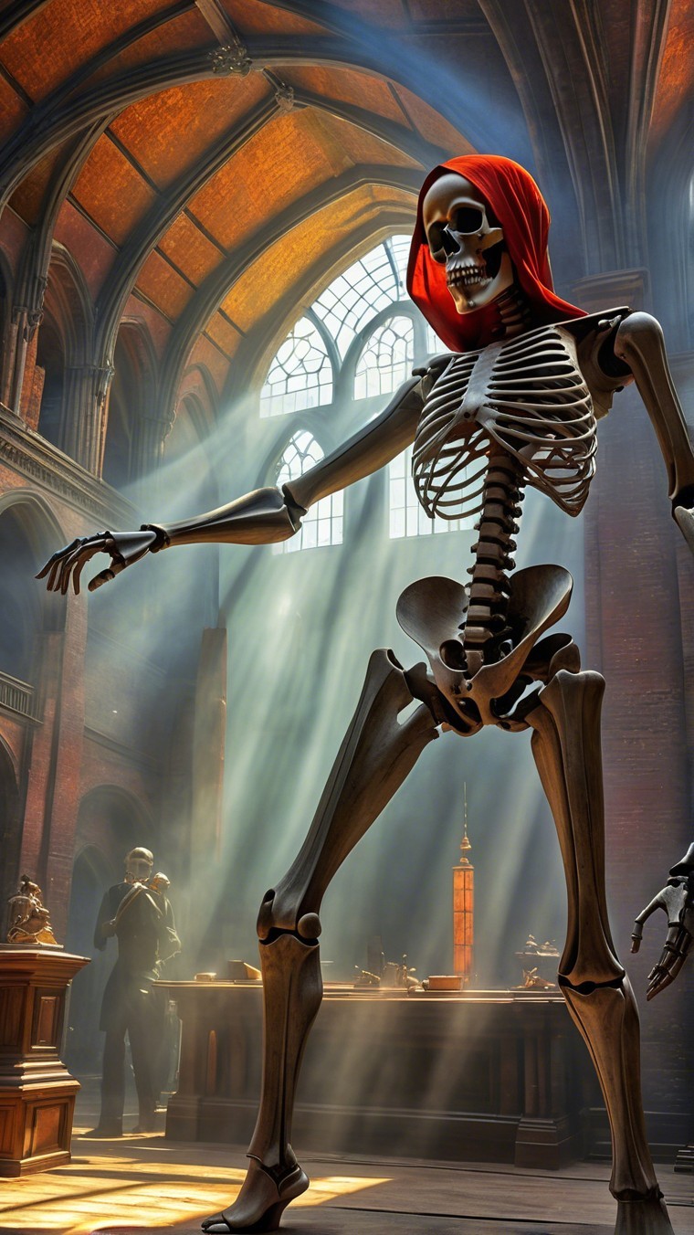 A life-sized skeleton stands in a grand, gothic hallway adorned with colorful stained glass windows. The sunlight filters through, casting vibrant patterns on the ornate carpet below.