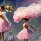 Two fantastical figures adorned in elaborate, floral-inspired dresses, adorned with gold accents, stand against a dreamy, swirling backdrop. One figure's hair flows like a cascade of flowers.