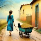 A woman in a blue dress walks her black dog along a cobblestone path between colorful rustic houses. The serene countryside and overcast sky create a peaceful atmosphere.