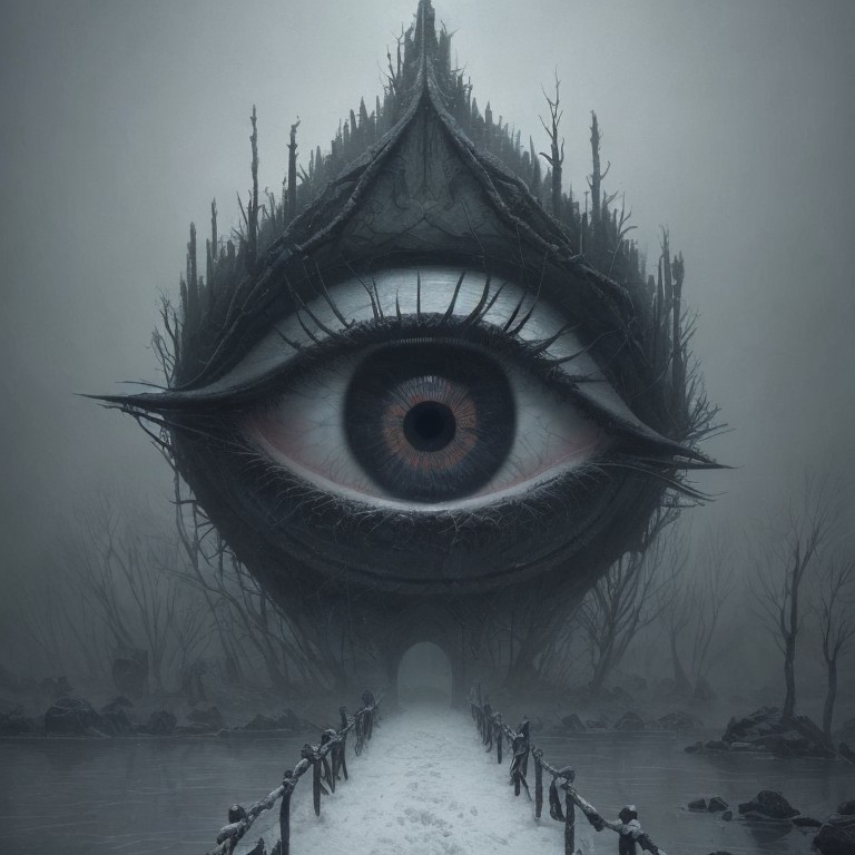 Surreal Eye-Shaped Structure in Gloomy Landscape