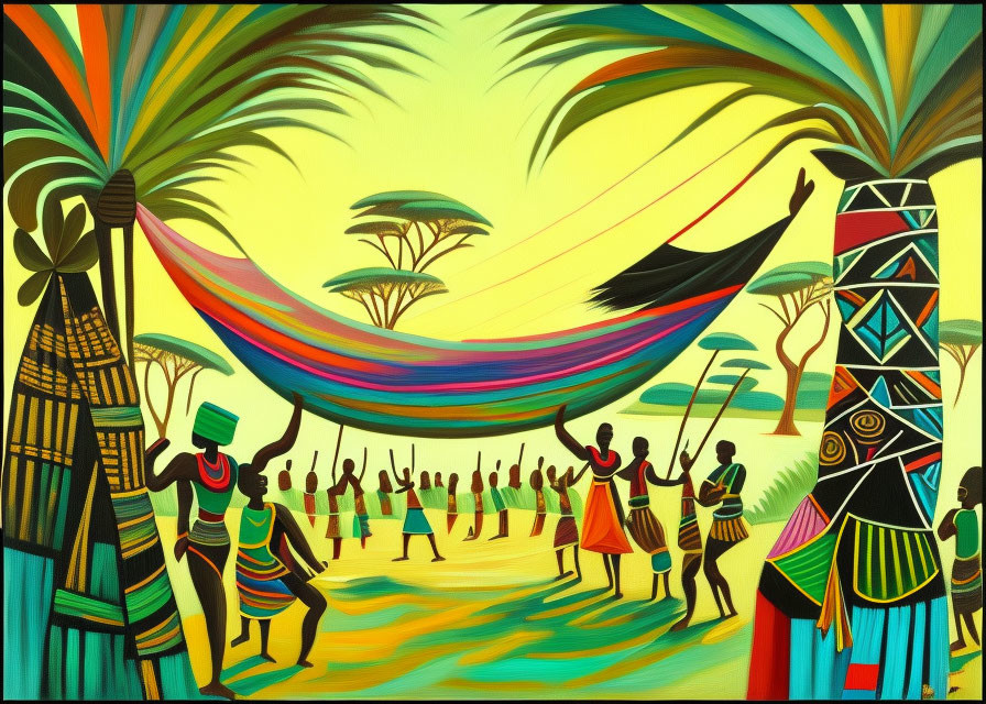 A colorful and expressive painting of a tribal village in Africa with people dancing around a fire at night. The style is inspired by Picasso’s African Period. Super-Resolution, Megapixel, Complex Detail, Super-Sharp, Ultra-High-Detail, No Text, UDH, HDR, 14k, HD