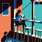 Girl reading a book in a cafe with her dog