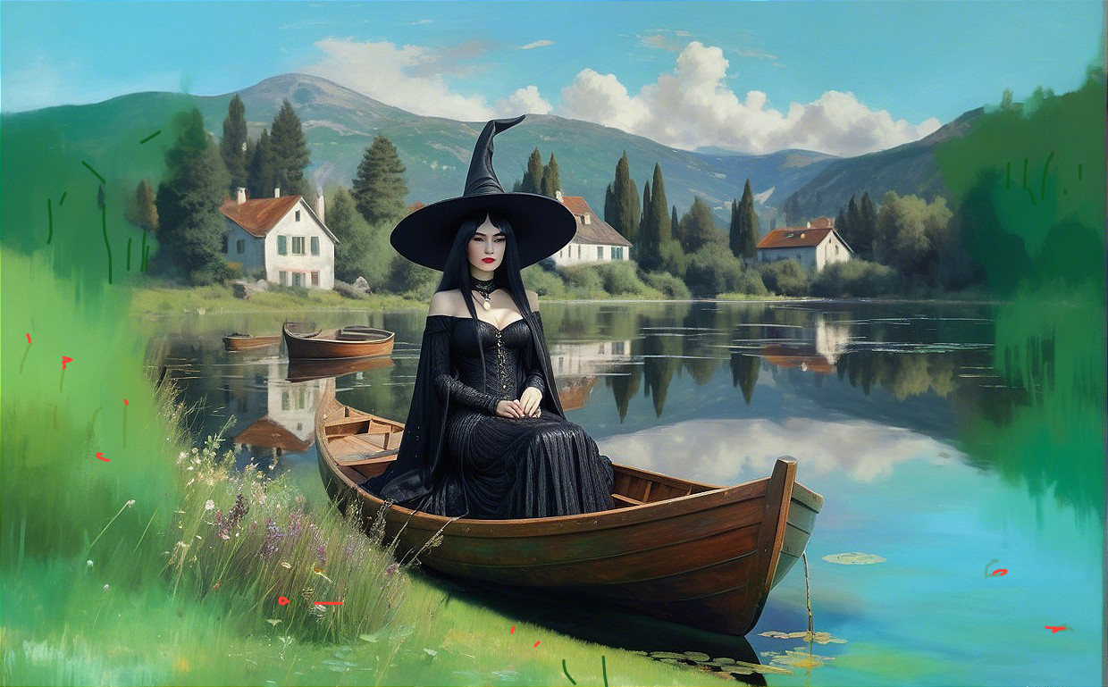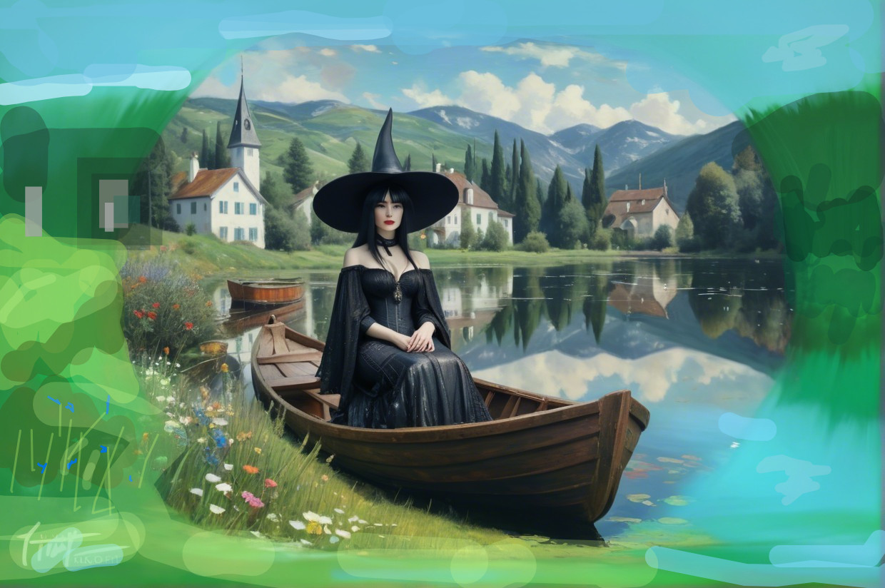 + Prompt:a photorealistic Monet masterpiece of abstraction and surrealism, highland lake background, witch with giant hat IN wooden boat, painted by Klimt, With undertones of paint splatter. highly detailed, elegant bright, beautiful cinematic postprocessing, H.R. Giger, Impressionist, Amedeo Modigliani ,, Yossi Kotler, Josef kote