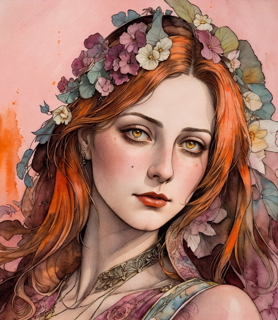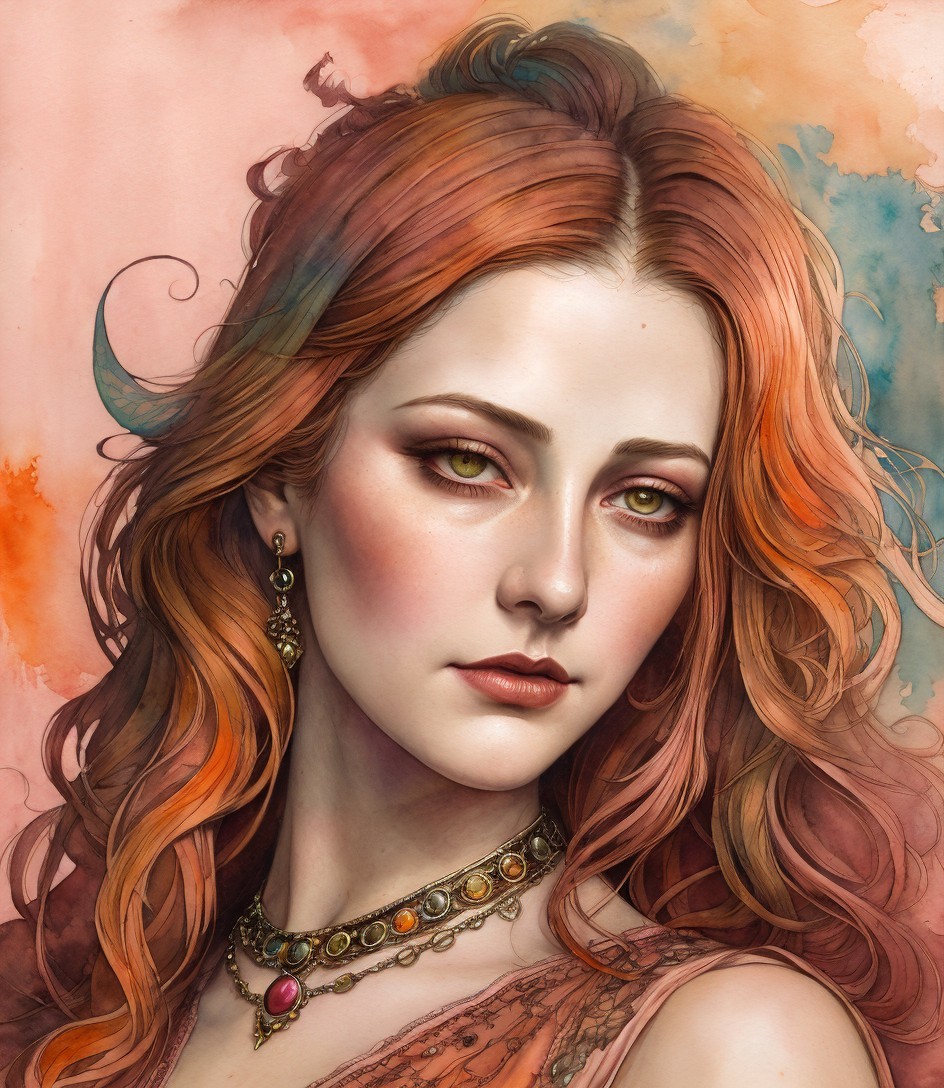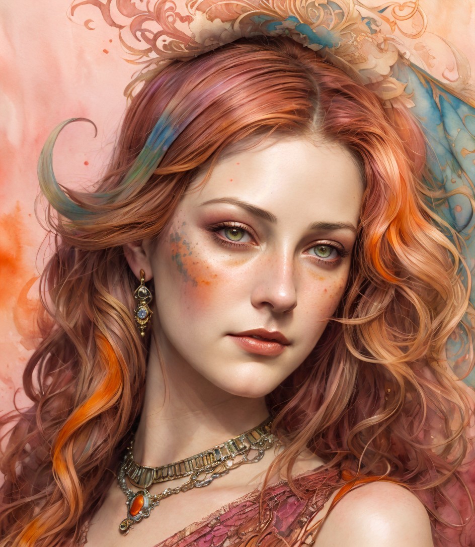 Portraiture, anthotype print of extroverted young heroine, tints of Geoff darrow and William timlin, Watercolor and ink, beautiful female enchantress looking lavishly, pink chaotic background, edwardian, detailed cheeks, triadic color scheme orange red beige, atylized realistic nose, wavery ink, textured paint, grunge, High coloring, detailed close-up portrait, stylized face, watery ink, Delicate, Dainty, Petite, Slender, Rosy-cheeked, Bright-eyed, Smiling, fearhered soft, dethereal, coffinwood 1.9, cottagegore 1.9, retrofuturistic details, supernatural, bioluminescent devilish eyes, Soft styllized hair as lineage, particles and splashes, soft edges, back-lit, grain, Schreger lines, high coloring 1.9, brushed textures, tints of pencil sketch art, triadic color scheme pink orange red, hues, gothical, instaport style 1.3, ((3d lighting effects, fauvism 1.7, encoustic strokes, chiaroscuro lighting, ambient occlusion 1.5, shadow mapping 1.3, (intricate stylized hairstyle, brightness 1.7, coherent, fauvistic) 9:7), eerie, occult, retropunk, creamy, plasticity 1.6, sweaty, tribal, occult, Anglocore 1.9, auracore, high coloring 1.9, mosscore 1.7, soft mist, cottagegore 1.9, retrofuturistic details of collar, maximalism, radiance, raytraced shadows 1.8 brightness 1.4, silver particles, dreamy Surrealism, 3d effects 1.8, shadow mapping 1.3, dynamic lighting 1.7, ambient occlusion 1.5, anisotropic filtering 1.9, raytraced shadows, complexion 1.7, plasticity 1.6, otherworldly, abstract style 1.7, lavish, dark fantasy style, grain, blurry aura, fantasy movie still, synthetic essence, tints of 1970s advertising art ,vector 9:5, eroticism, dark fantasy art, beautiful composition 1.9,