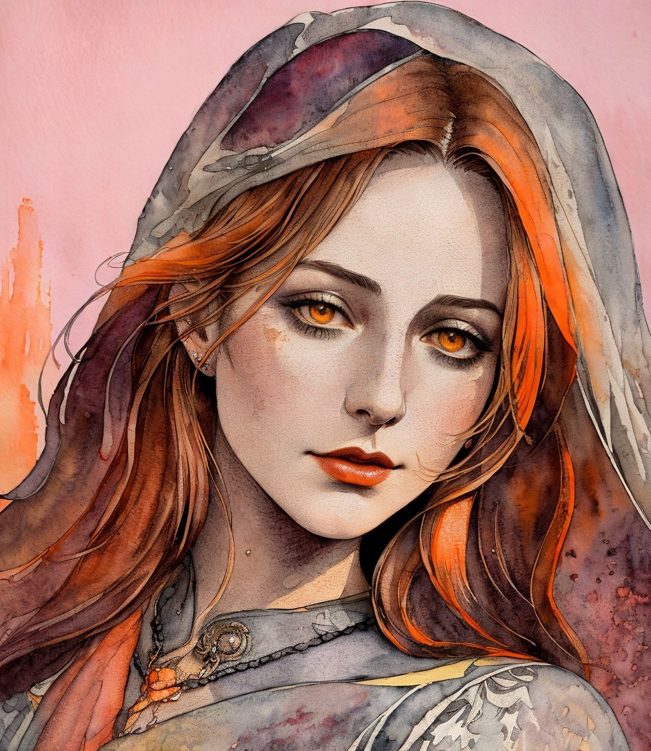 Portraiture, anthotype print of heroine, tints of Geoff darrow and William timlin, Watercolor and ink, beautiful female enchantress in rain, grey chaotic background, edwardian, detailed cheeks, triadic color scheme orange red beige, realistic nose, wavery ink, textured paint, grunge, High coloring, detailed close-up portrait, stylized face , watery ink, Delicate, Dainty, Petite, Slender, Rosy-cheeked, Bright-eyed, Smiling, dethereal, coffinwood 1.7, cottagegore 1.9, retrofuturistic details, supernatural, bioluminescent eyes, Soft hair, flares and splashes, soft edges, back-lit, brushed textures, tints of sketch art, triadic color scheme purple black red, hues, gothical, instaport style 1.6, 3d lighting effects, fauvism 1.7, chiaroscuro lighting, ambient occlusion 1.5, shadow mapping 1.3, intricate stylized hairstyle, brightness 1.7, coherent, fauvistic, eerie, occult, retropunk, creamy, plasticity 1.6, sweaty, tribal, occult, Anglocore 1.9, auracore, high coloring 1.9, mosscore 1.7, cottagegore 1.9, retrofuturistic details of collar, maximalism, radiance, raytraced shadows 1.8 brightness 1.4, silver particles, dreamy Surrealism, 3d effects 1.8, shadow mapping 1.3, dynamic lighting 1.7, ambient occlusion 1.5, anisotropic filtering 1.9, raytraced shadows, ethereal, plasticity 1.6, otherworldly, abstract style 1.7, lavish, dark fantasy style, grain, blurry aura, fantasy movie still, synthetic essence, tints of 1970s advertising art ,vector 9:5, eroticism, dark fantasy art,