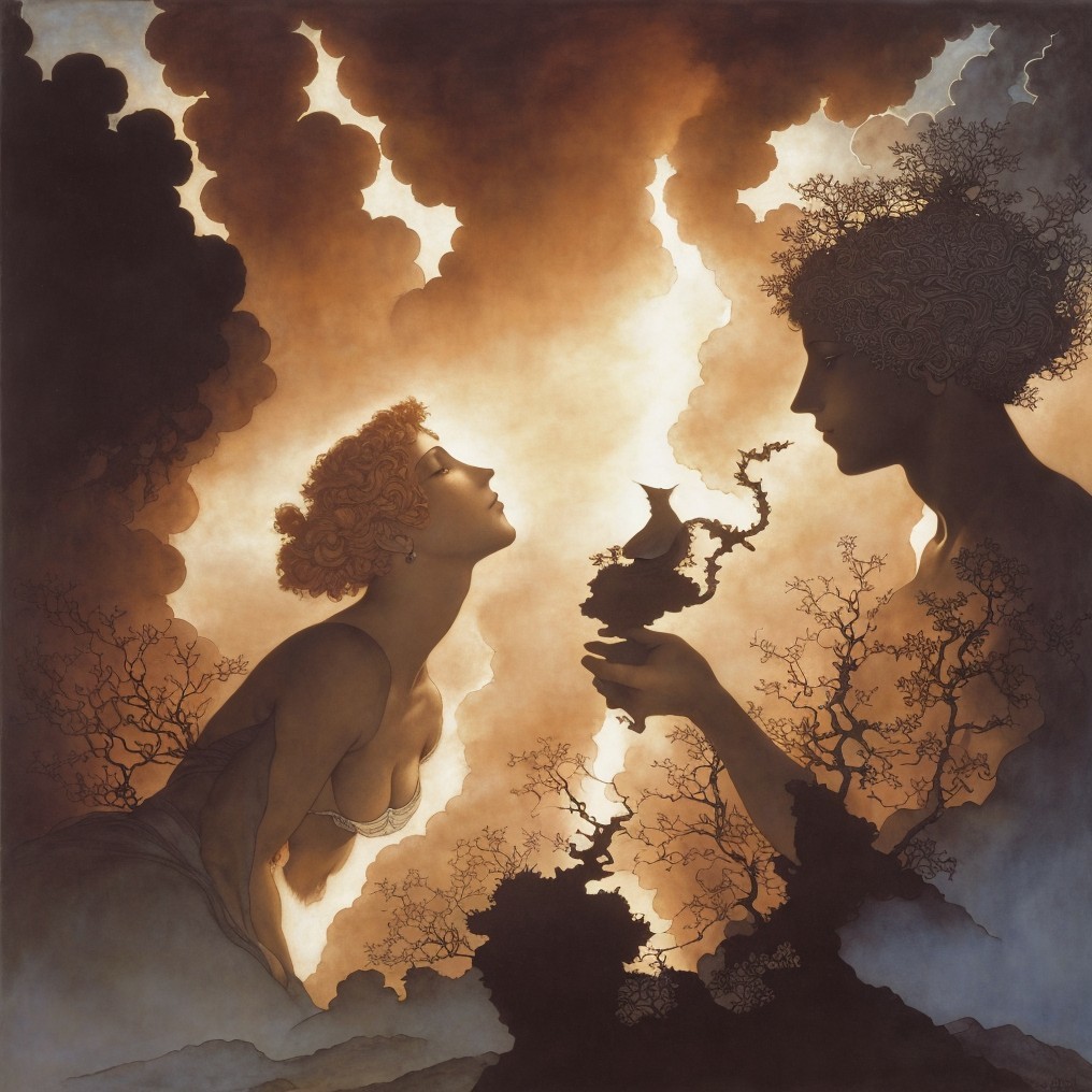 A woman in a Victorian-inspired dress interacts with a vintage light fixture, her elegant profile highlighted by soft lighting, blending steampunk elements with artistic beauty.