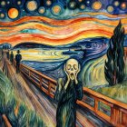A surreal landscape features a lone figure in black, surrounded by abstract mountains and vivid planets. Dark shadows loom, creating an eerie atmosphere, while a white animal walks nearby.
