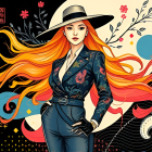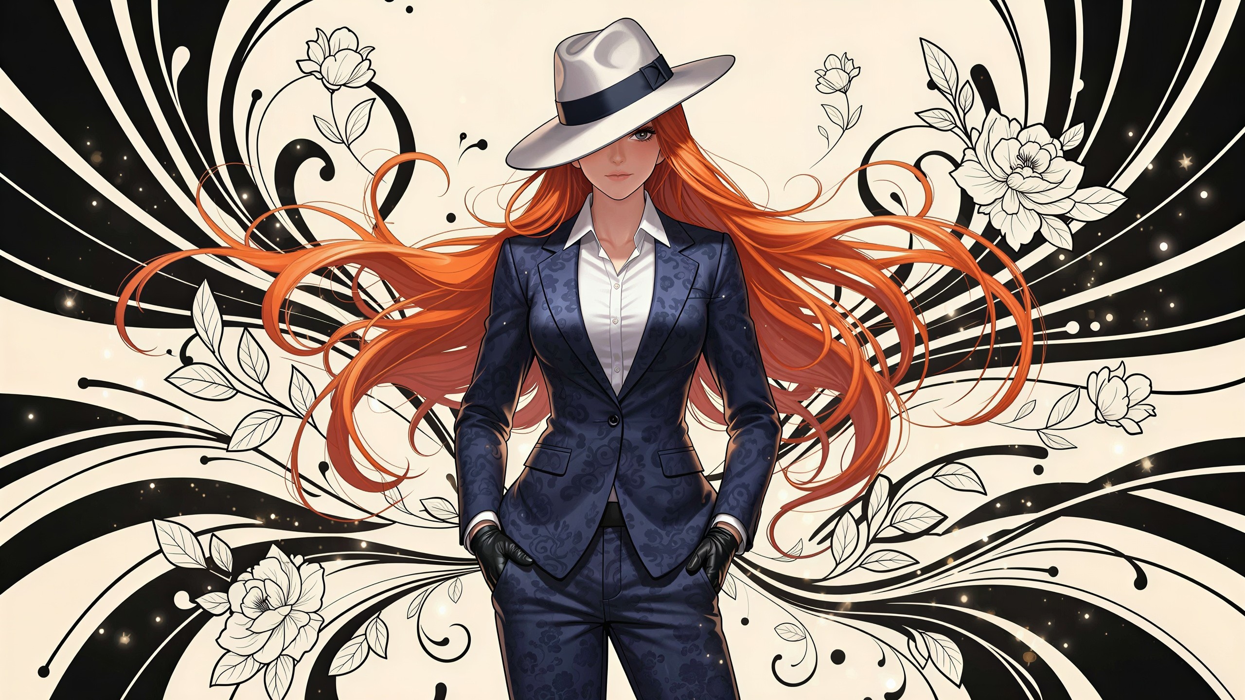 An anime-style digital painting features a formidable woman with striking long, flowing ginger hair and captivating green-blue eyes, partially hidden by a stylish white fedora with a black band. She is dressed in a dark blue, ornate patterned suit, consisting of a tailored blazer and matching trousers, and a