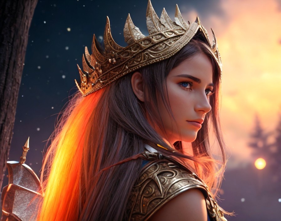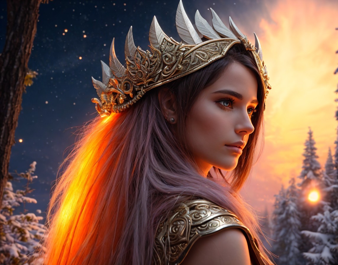 Woman with Pink Hair and Crown at Fantasy Castle Sunset