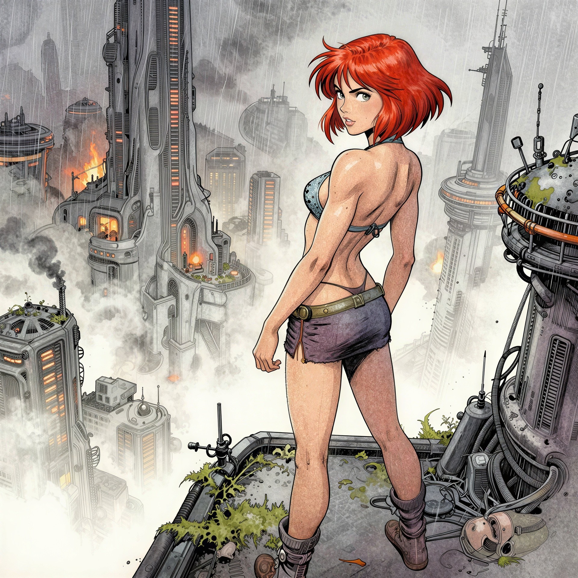 A digital painting of a muscular young woman with shoulder-length red hair, standing on a rooftop in a post-apocalyptic cityscape, a futuristic city filled with tall, irregularly shaped buildings in shades of gray, some with lit windows indicating remaining occupancy, and others in various states of disrepair with visible