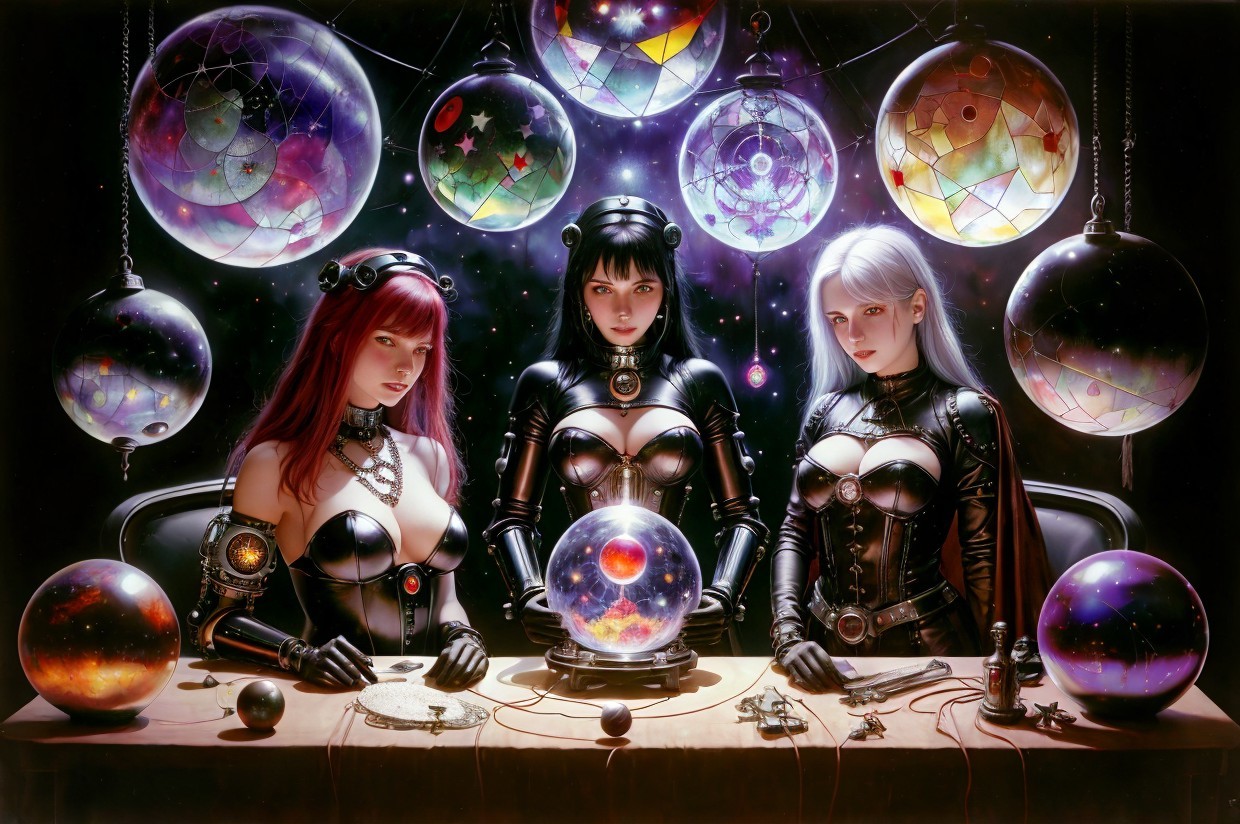 Three Women in Futuristic Outfits Surrounded by Cosmic Imagery