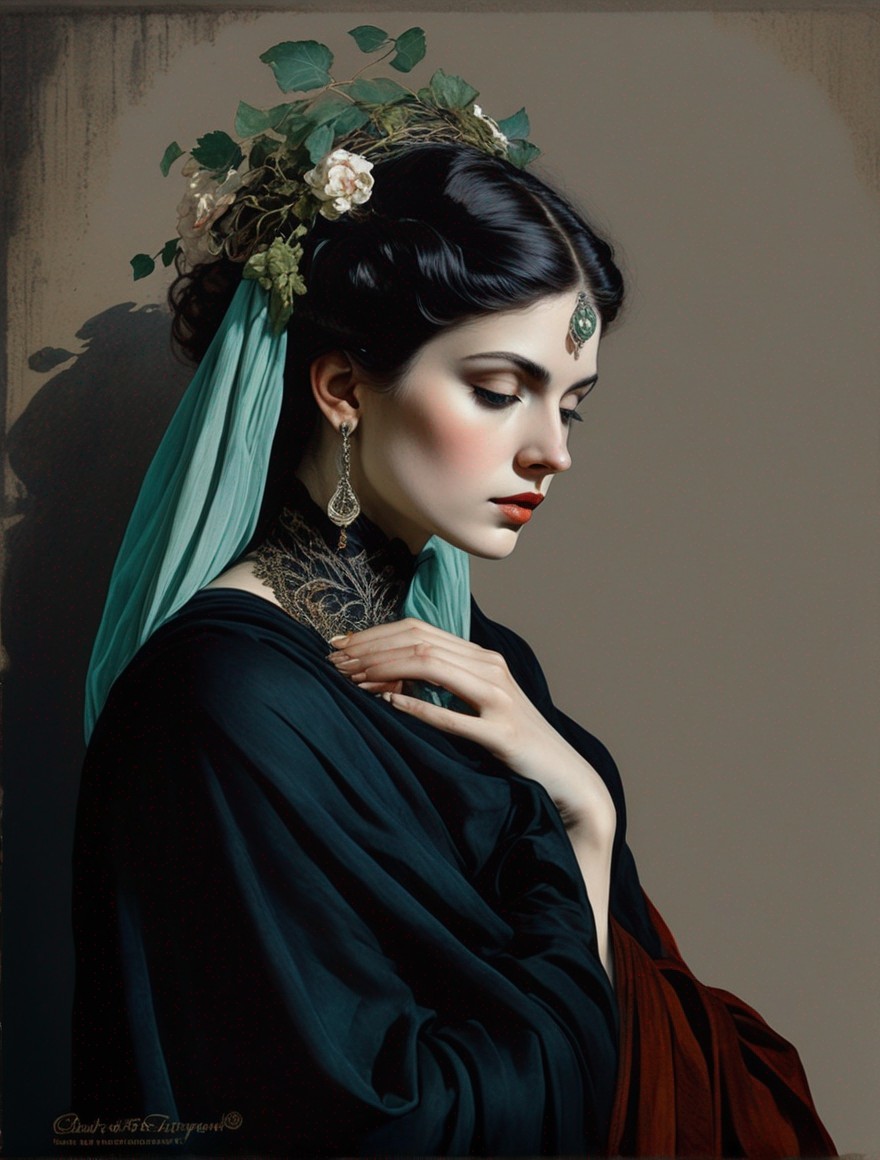 Portrait of woman with elegant makeup, green shawl, and leaf headpiece.