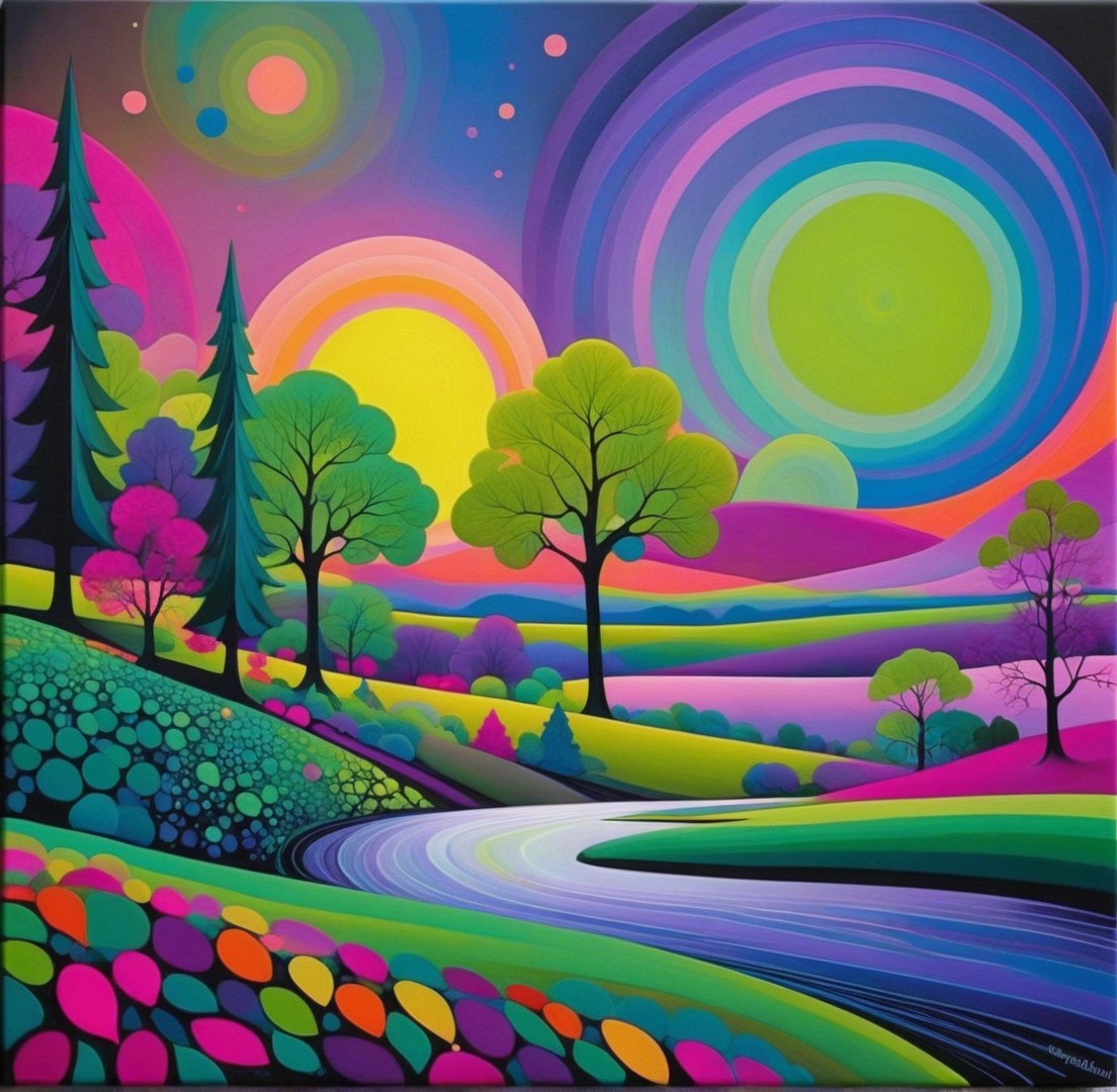 A vibrant, surreal landscape features colorful trees, rolling hills, and a winding river, all set against a backdrop of swirling pastel skies and radiant suns in vivid hues.